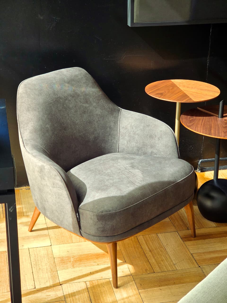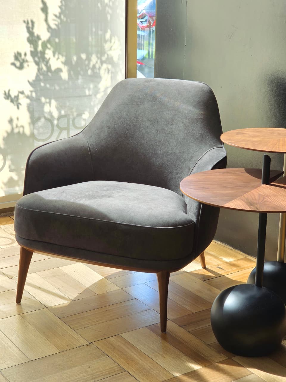 Diseñado Studio Saccaro. Cuerpo acolchado y patas en madera maciza. Tela Beige 319.