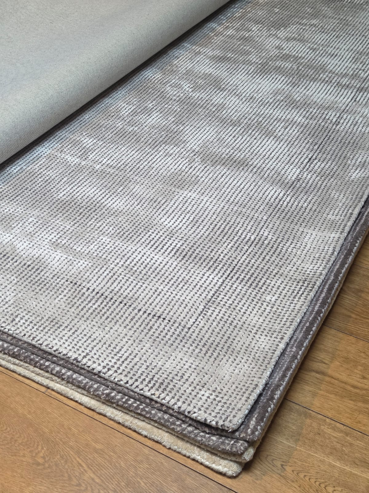 Alfombra tejida a mano, composición tencel, seda y lana.