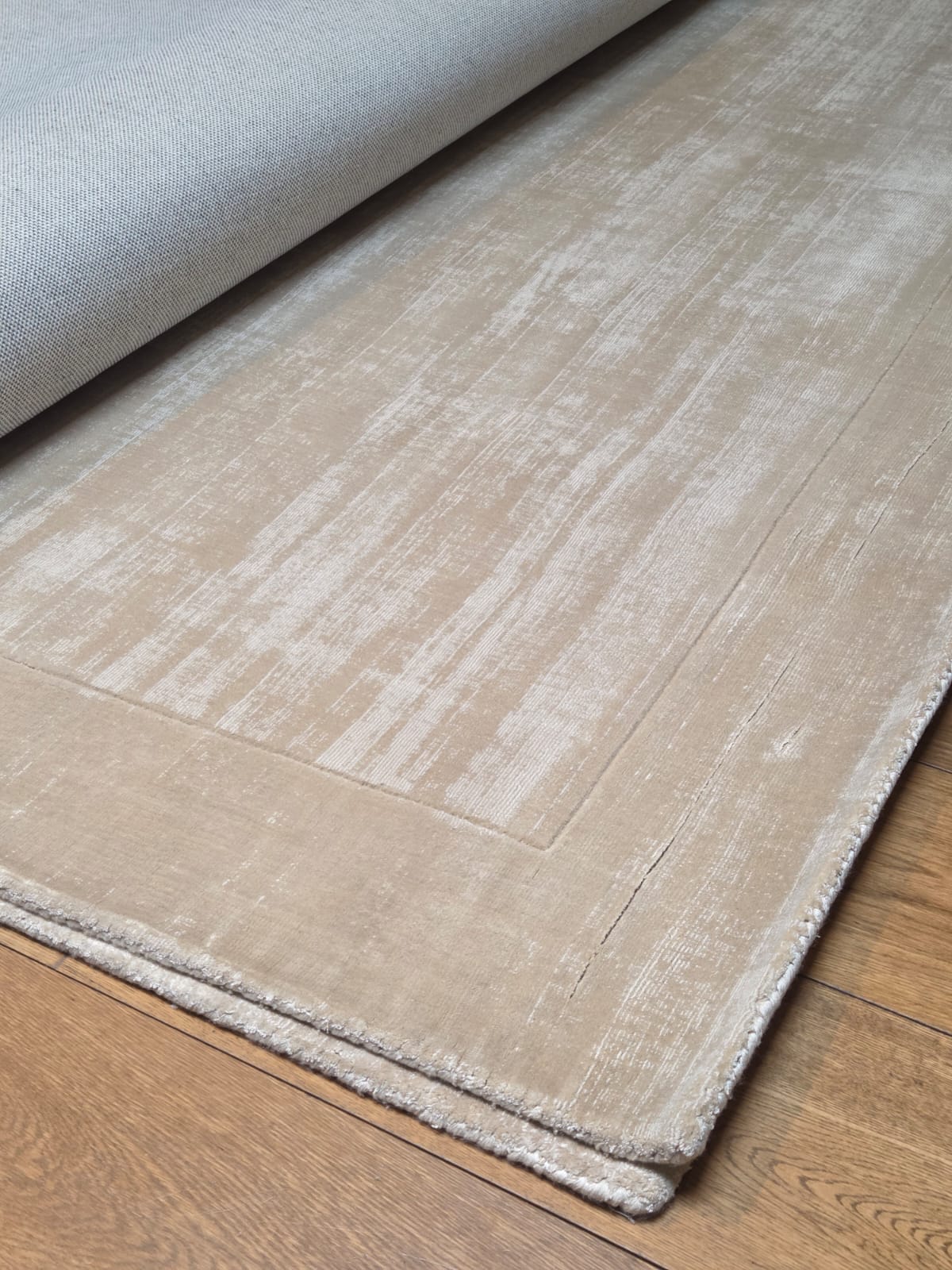 Alfombra tejida a mano, composición tencel, seda y lana.
