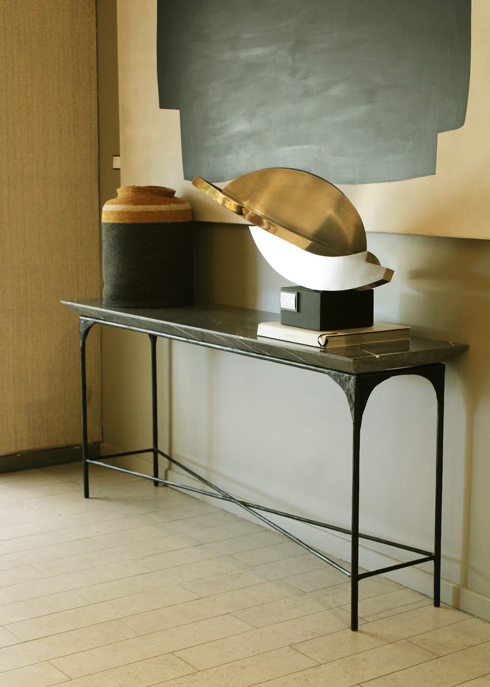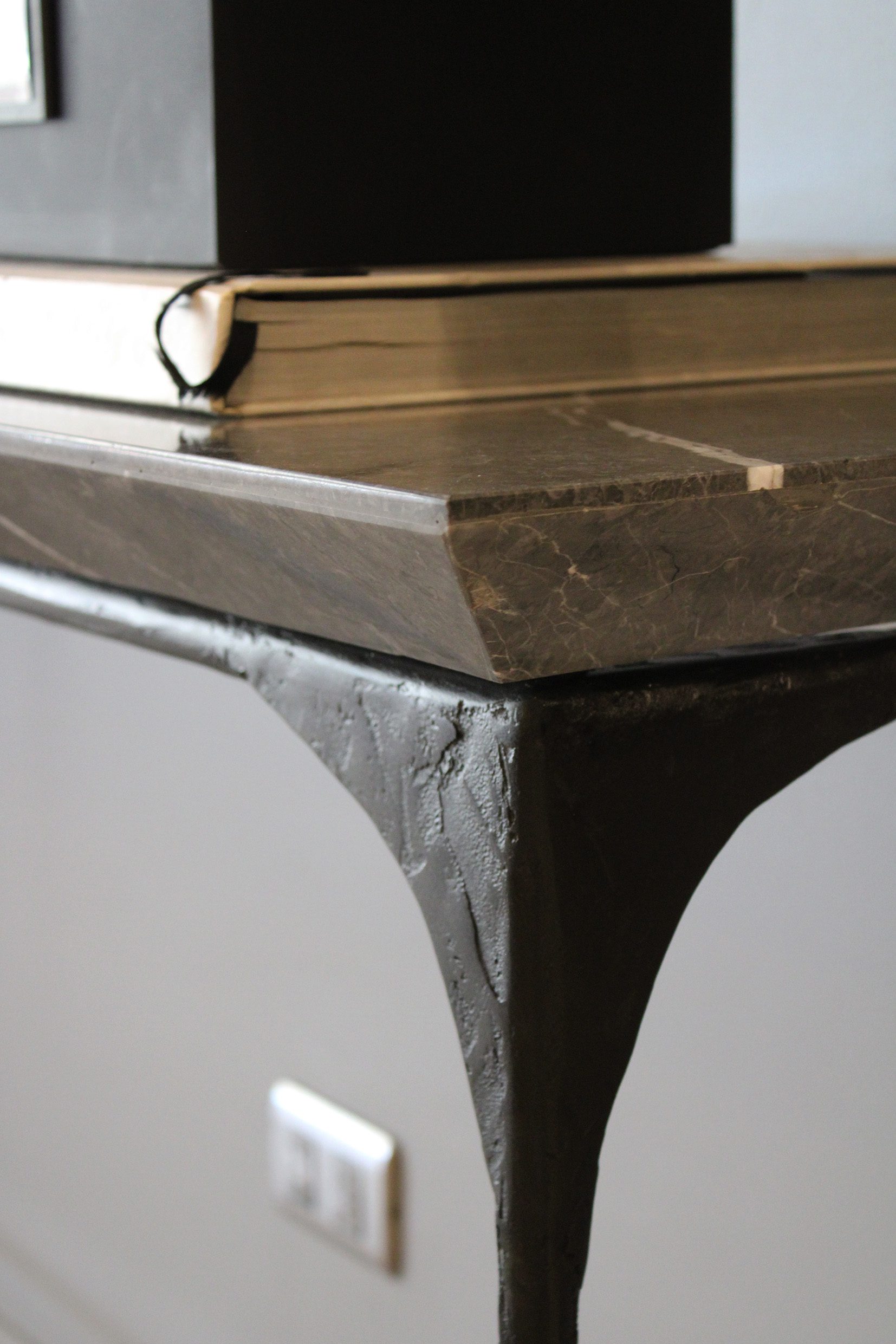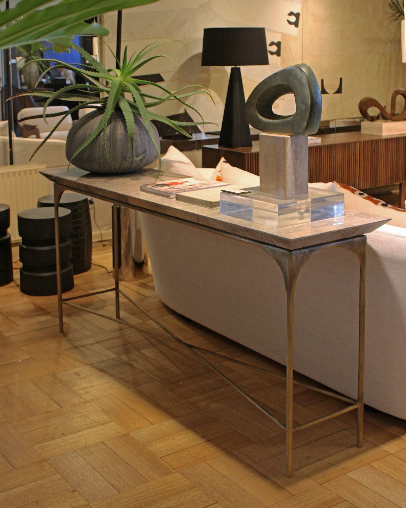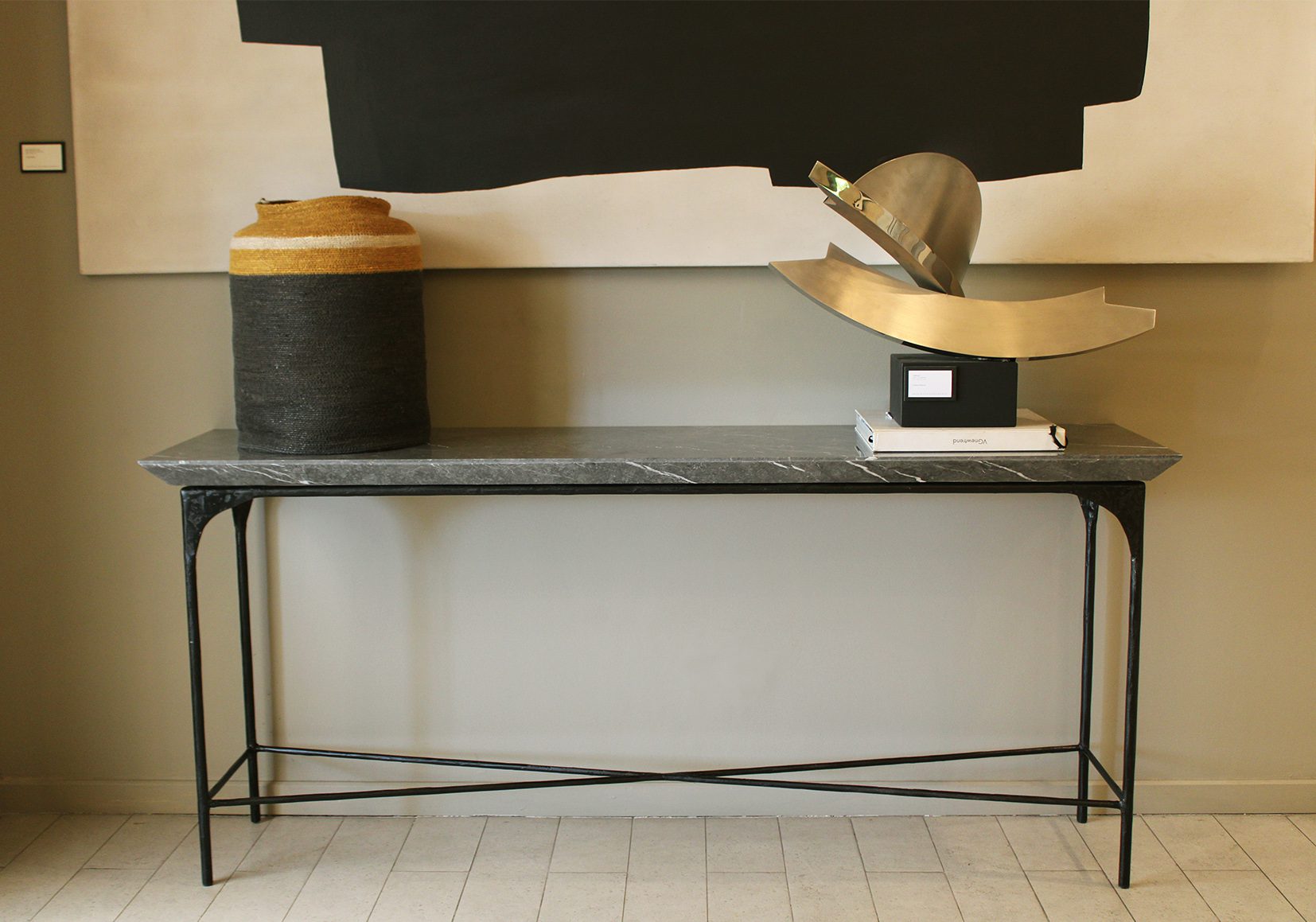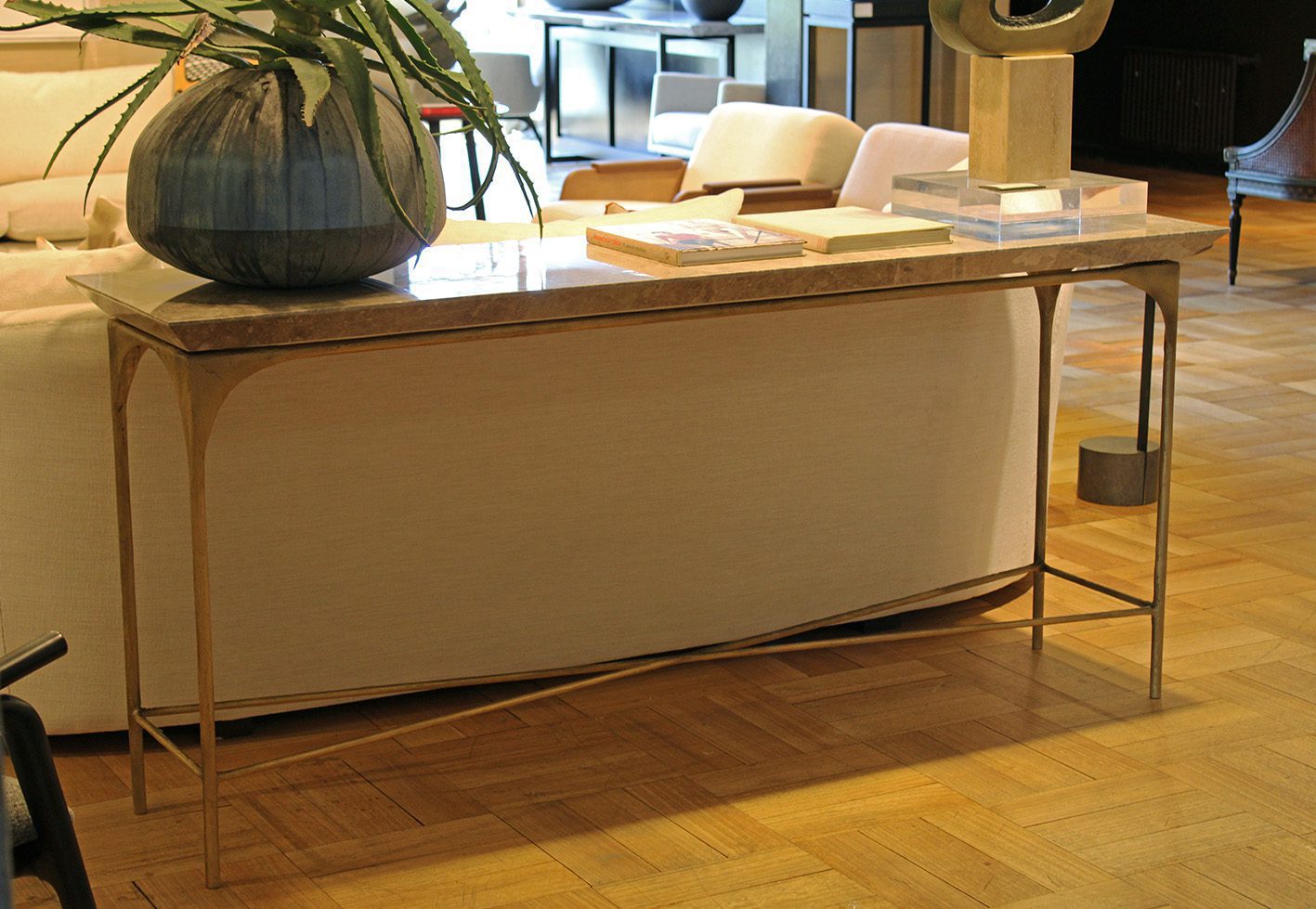 Arrimo con estructura de metal en patina negra o pátina de bronce, con cubierta de mármol «Slim Stone» terminación según disponibilidad
