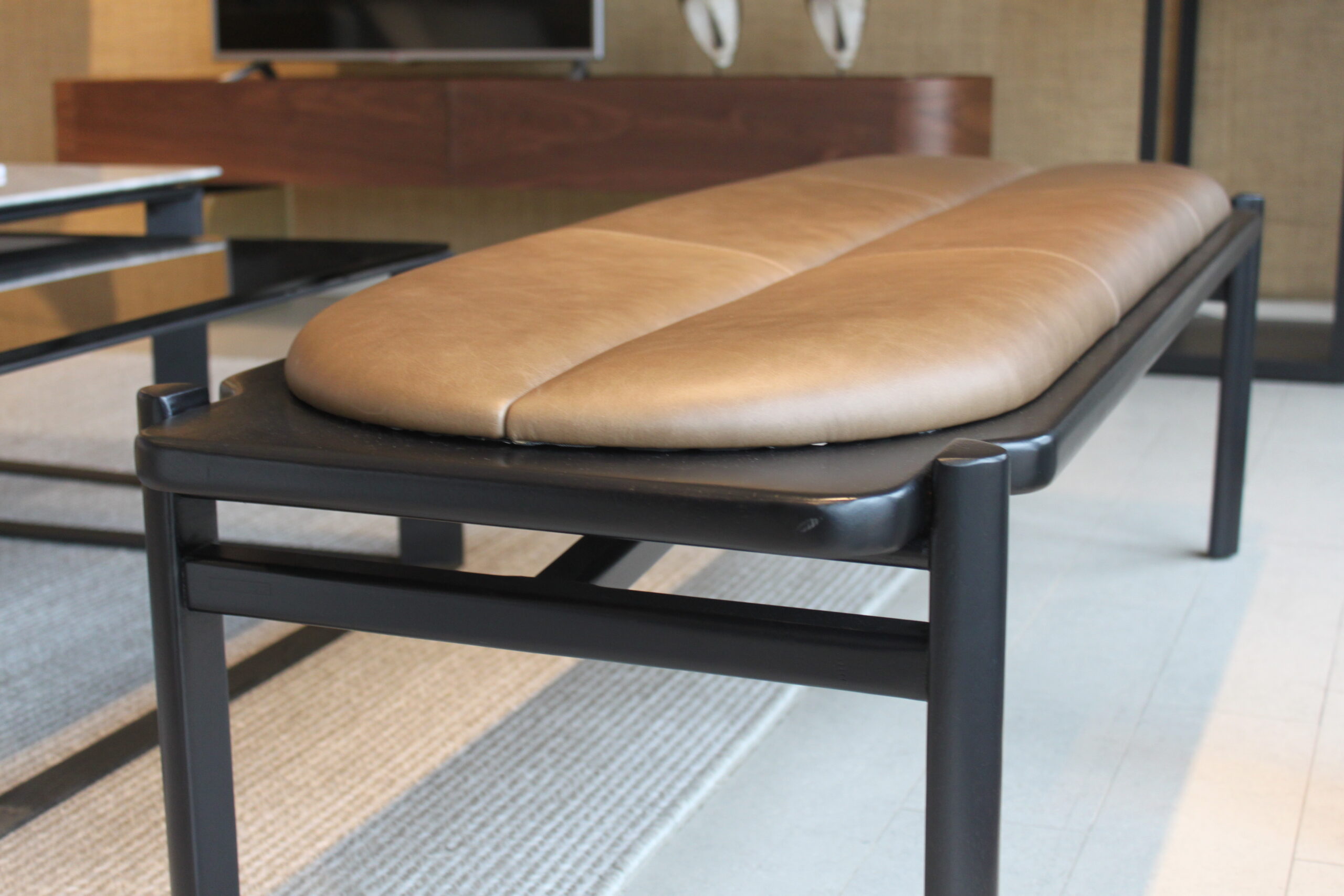 Banqueta diseñada por Studio Saccaro. Estructura en madera maciza de Jequitibá y cantos redondeados, asiento tapizado en cuero compuesto de dos partes, simulando el efecto de costura central