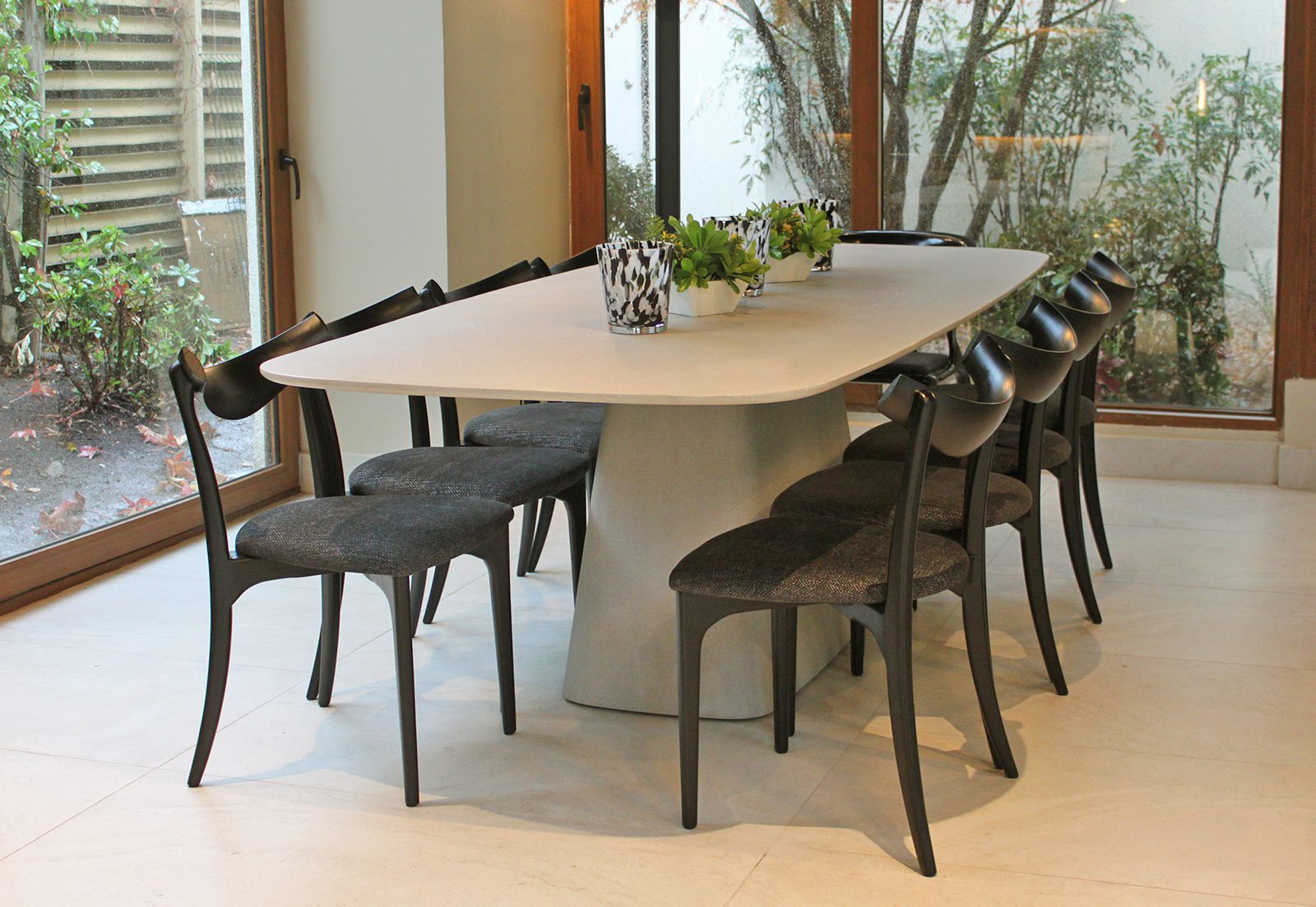 Comedor de fibroresina color gris, ideal para exteriores.