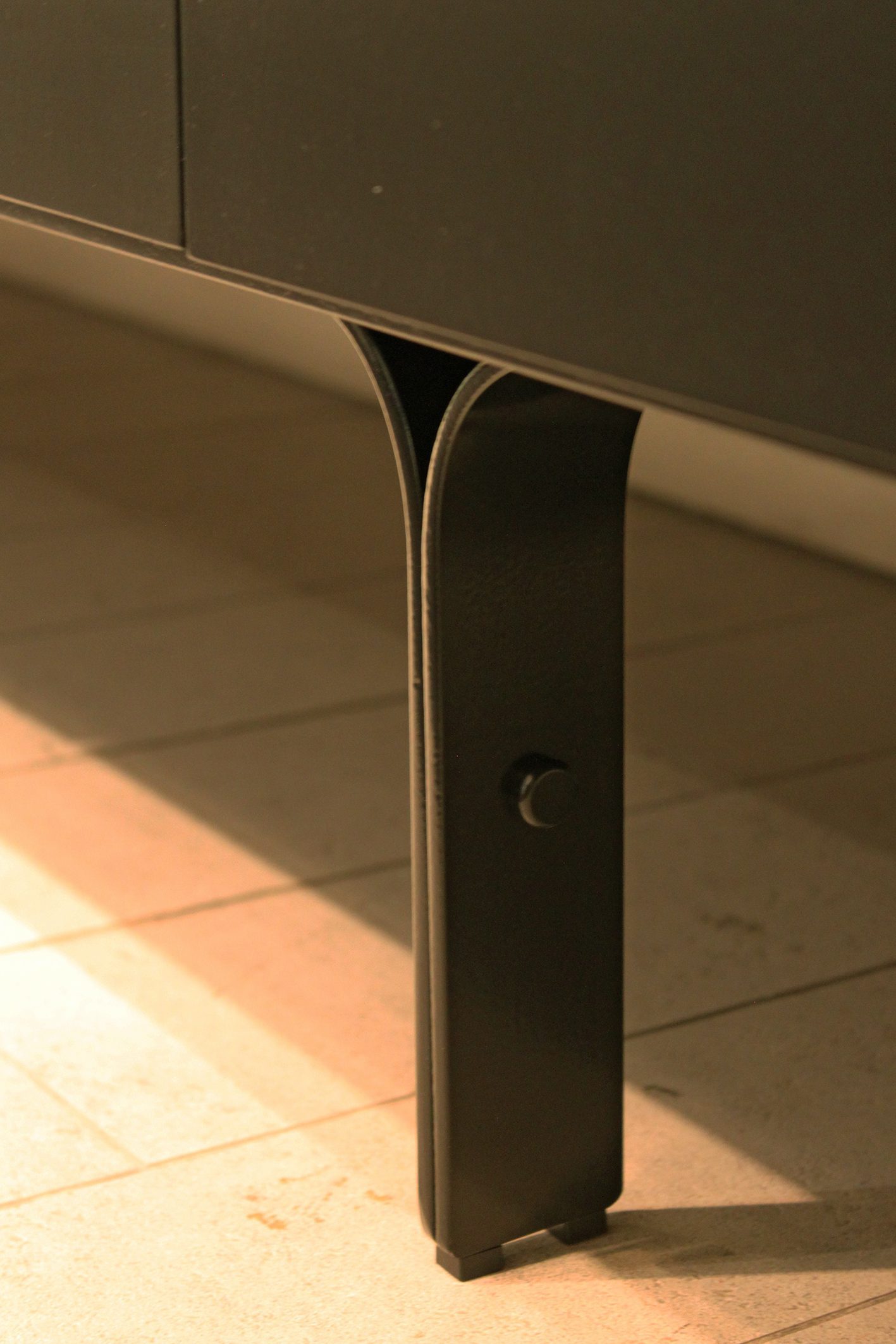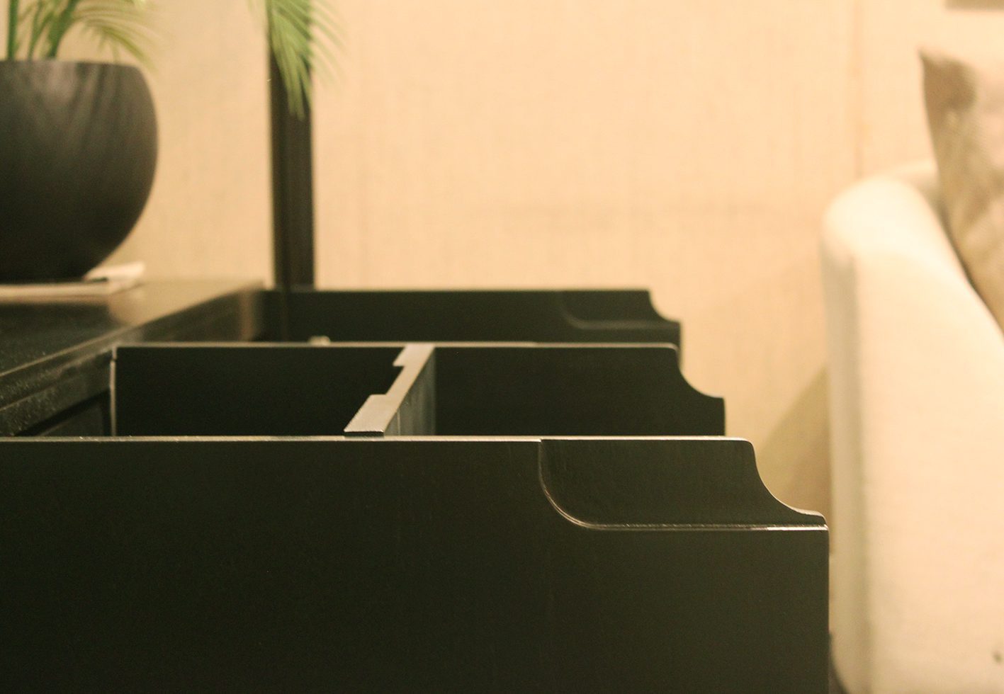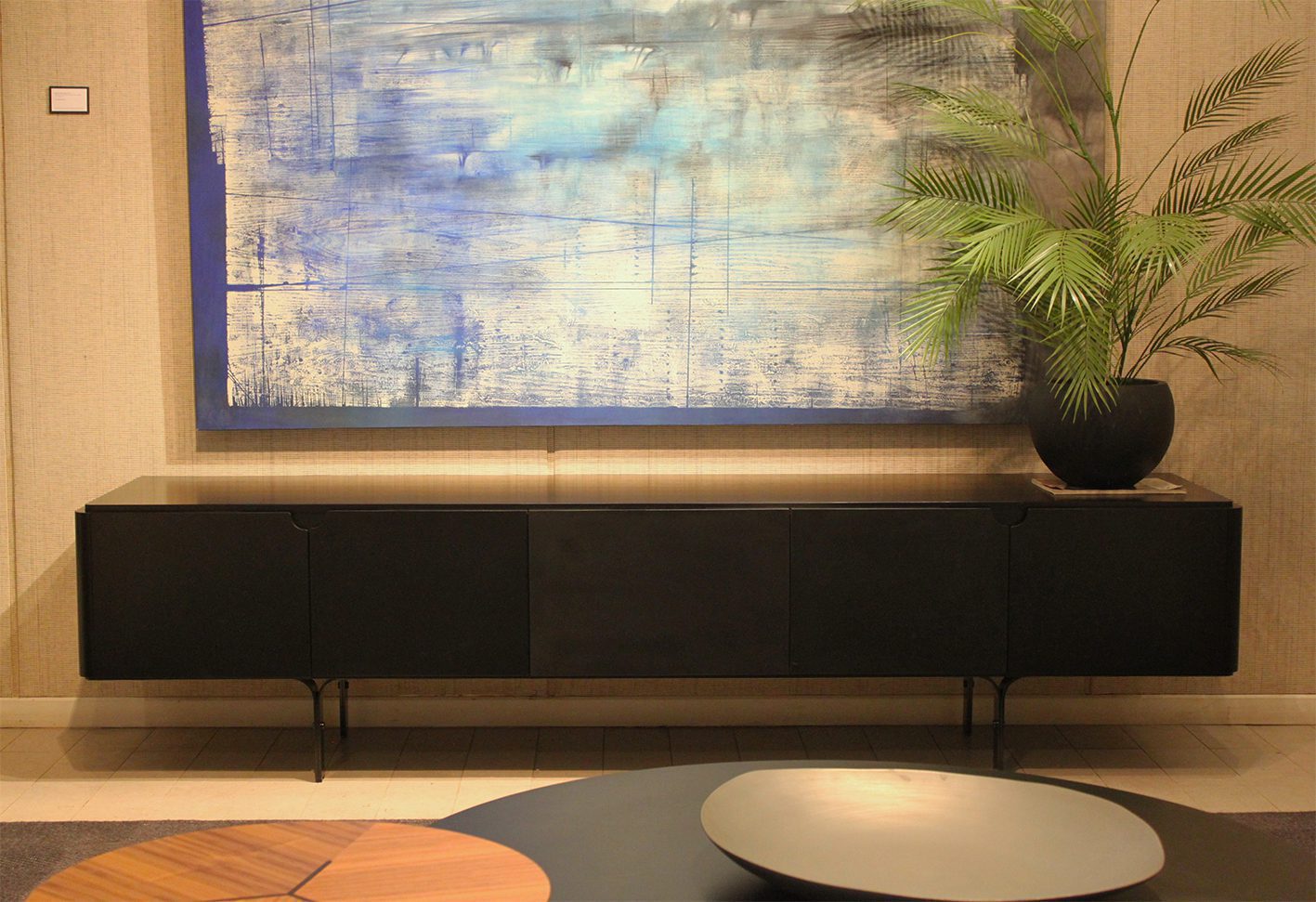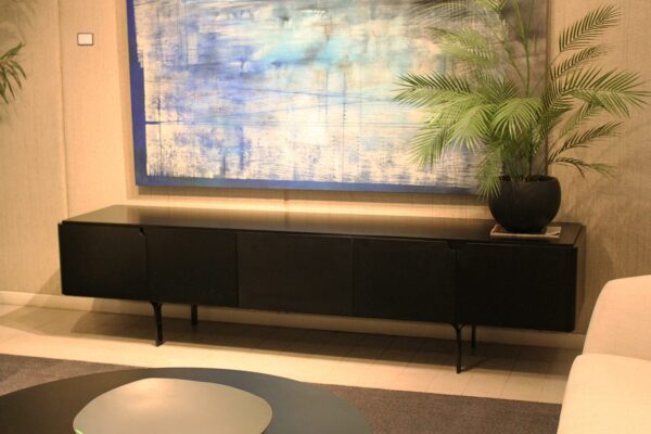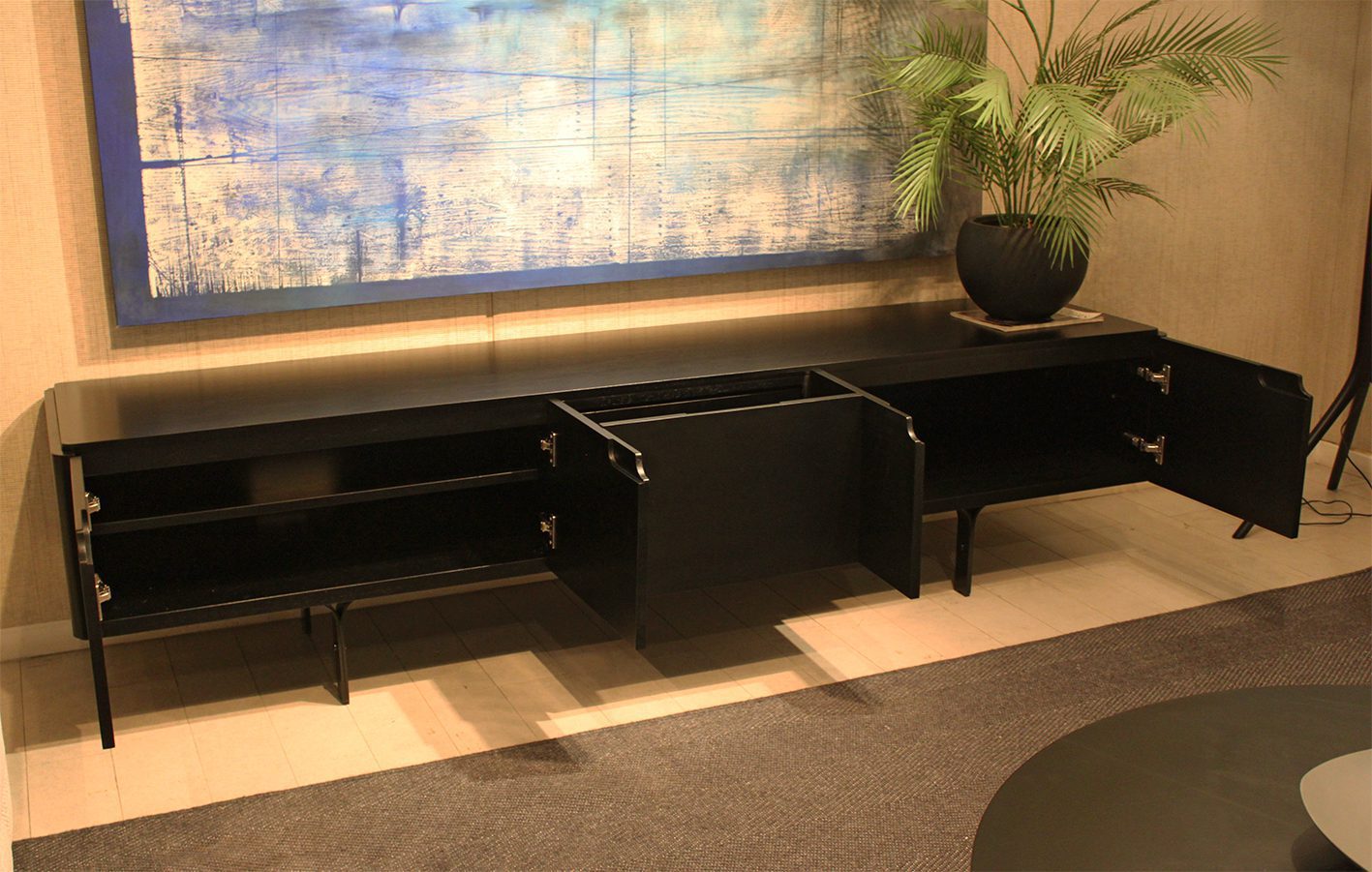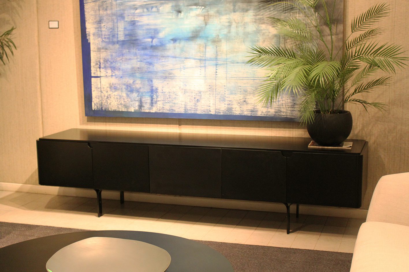 Home Theater/buffet brasilero, diseñado por Luan del Savio para Saccaro. Tiene 4 puertas con sistema de apertura con bisagras con amortiguación. La puerta central tiene división con estante móvil y cajón central. Terminación color ébano