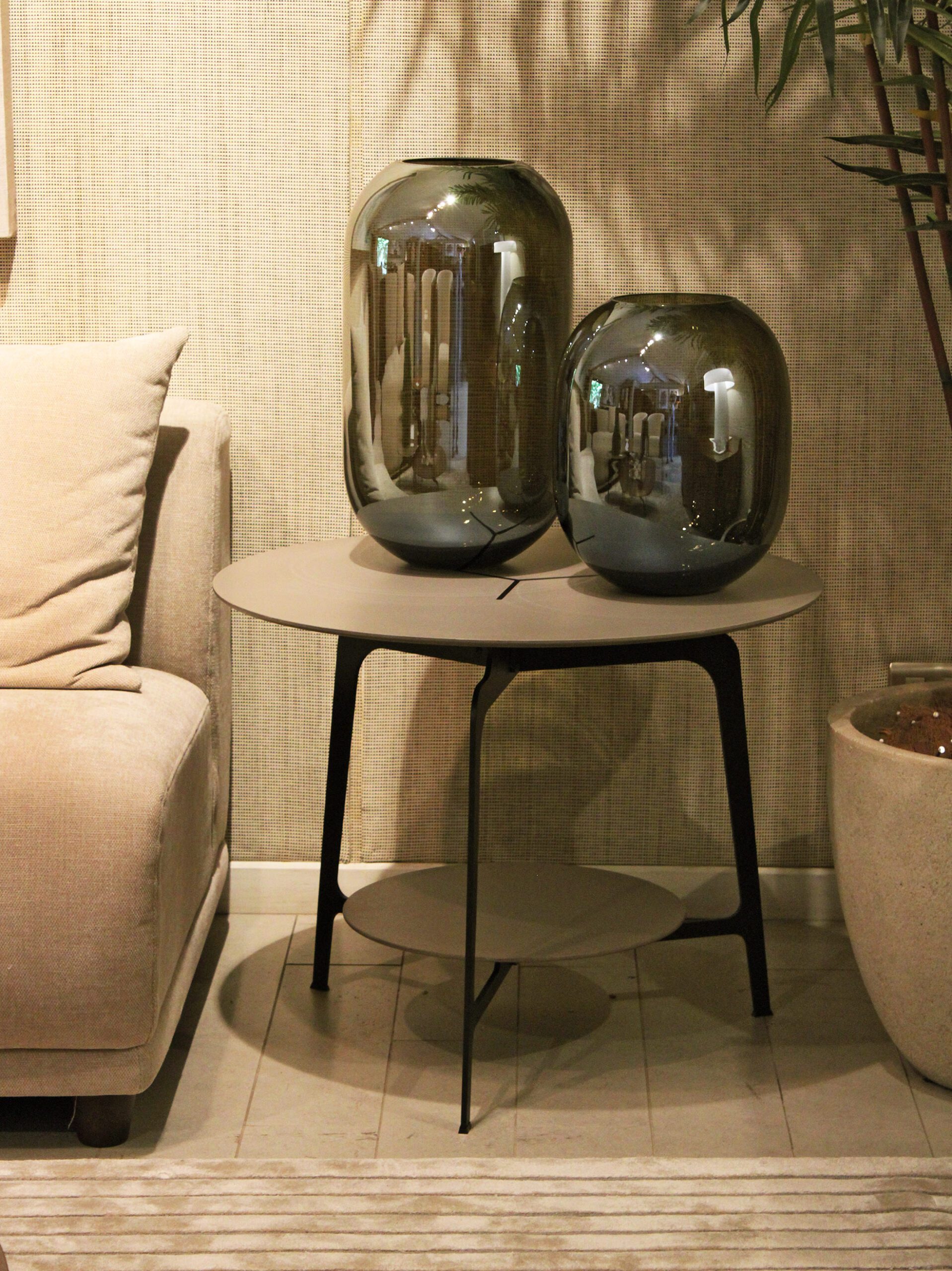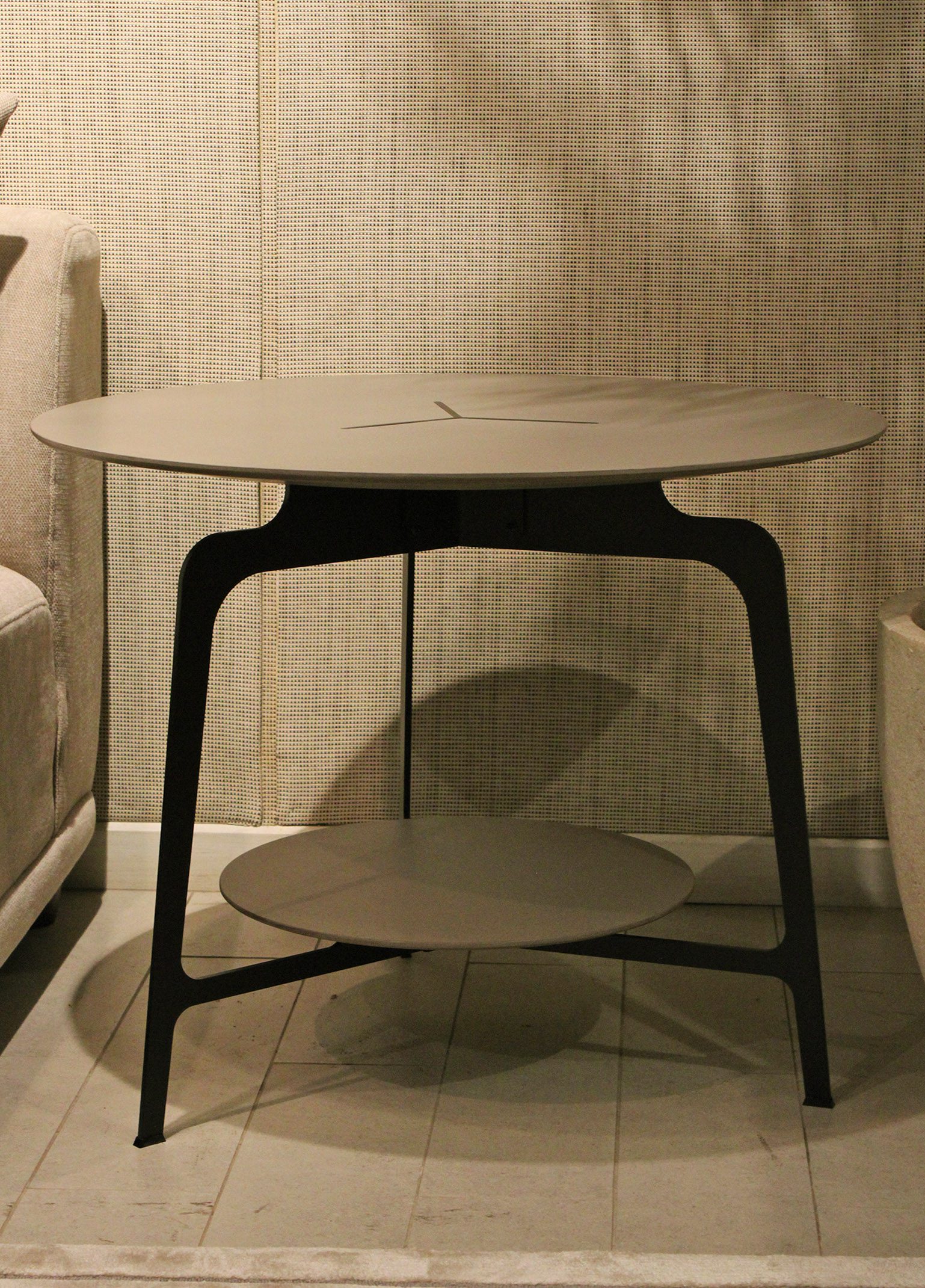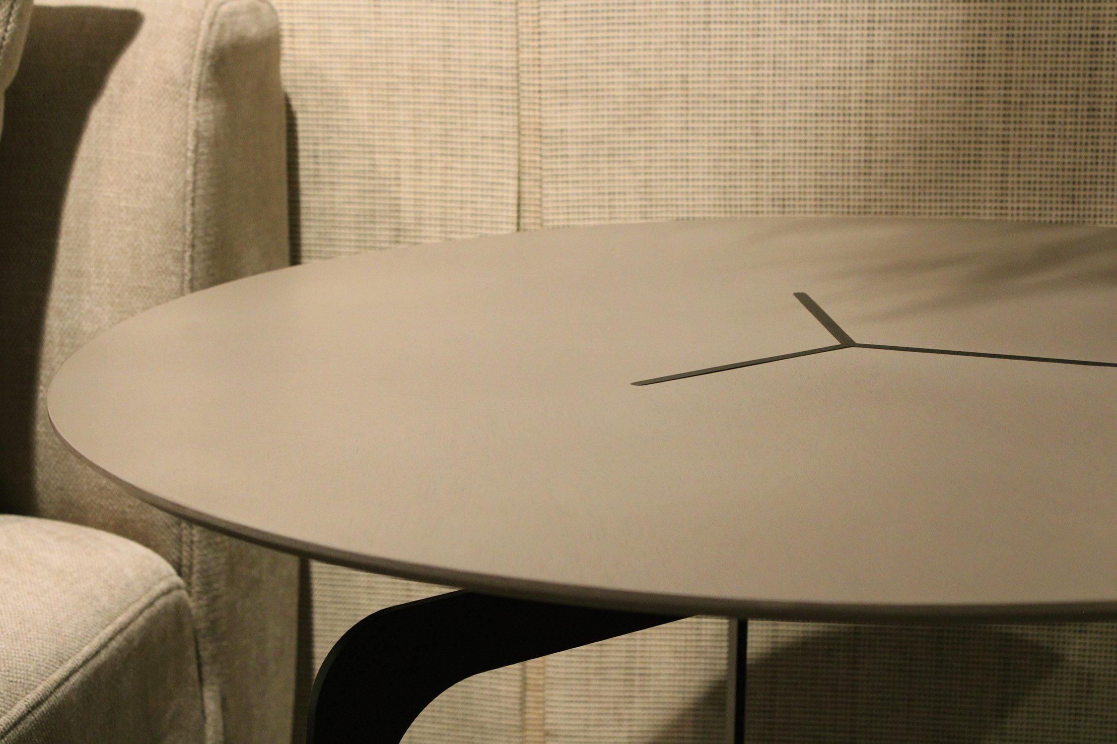 Diseñada por Bruno Faucz para Saccaro. Base en acero terminación negro matte, cubierta en chapa natural de Jequtibá terminación tartufo.