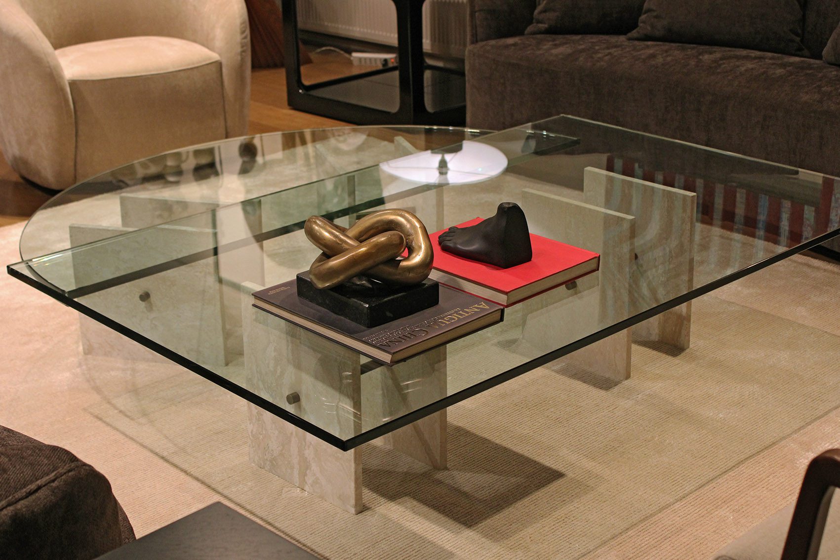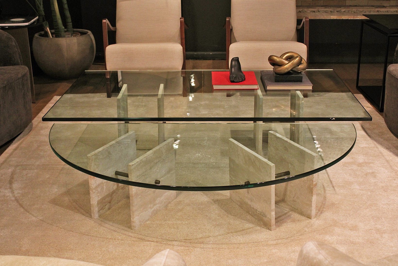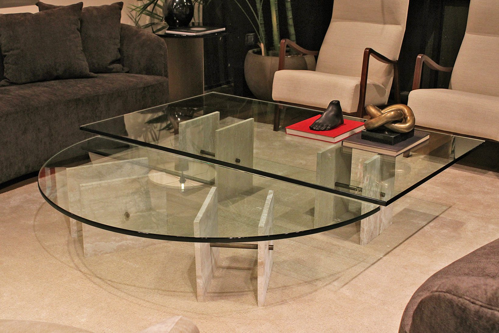 La mesa de centro Boston tiene cubiertas de vidrios de 19 mm de espesor y bases conformadas por dos piezas rectangulares de mármol travertino y una barra de bronce.