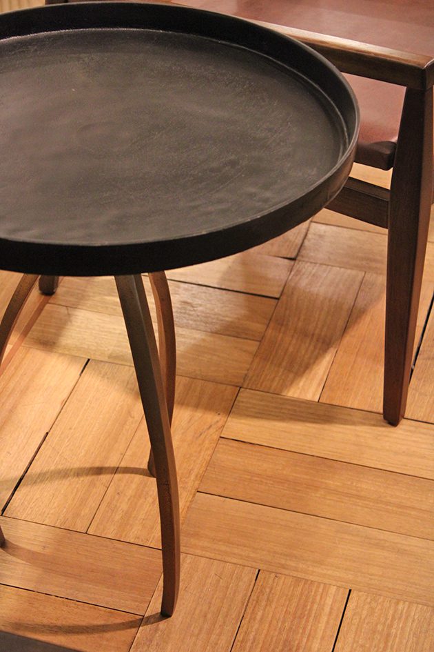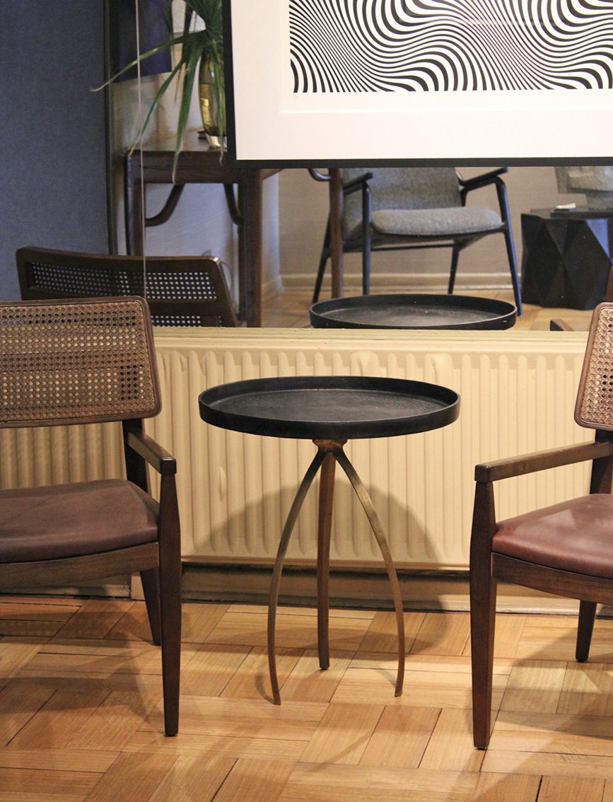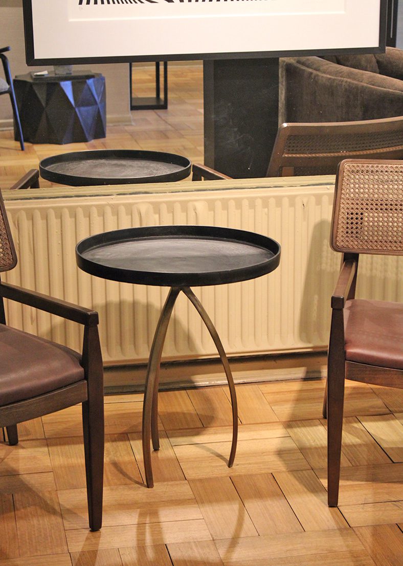 Mesa lateral hecha de aleaciones metálicas, cubierta negra y base dorado envejecido.