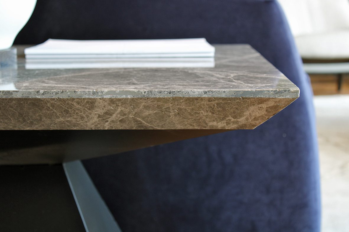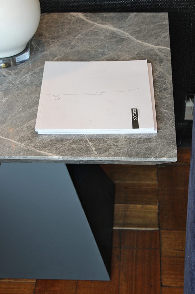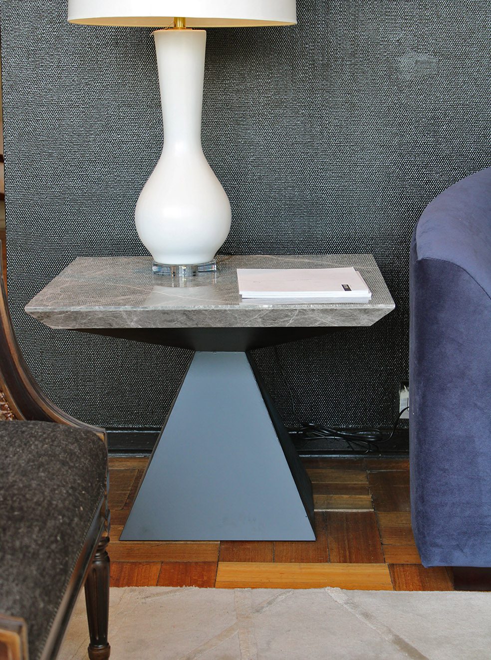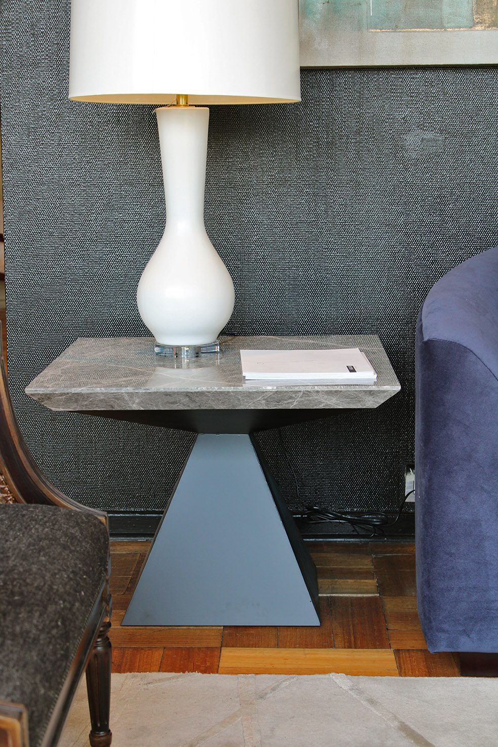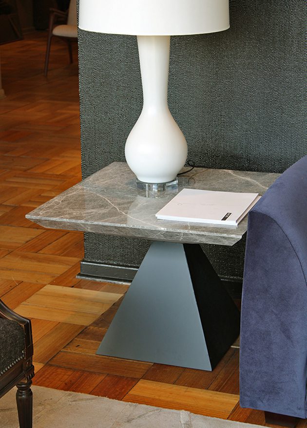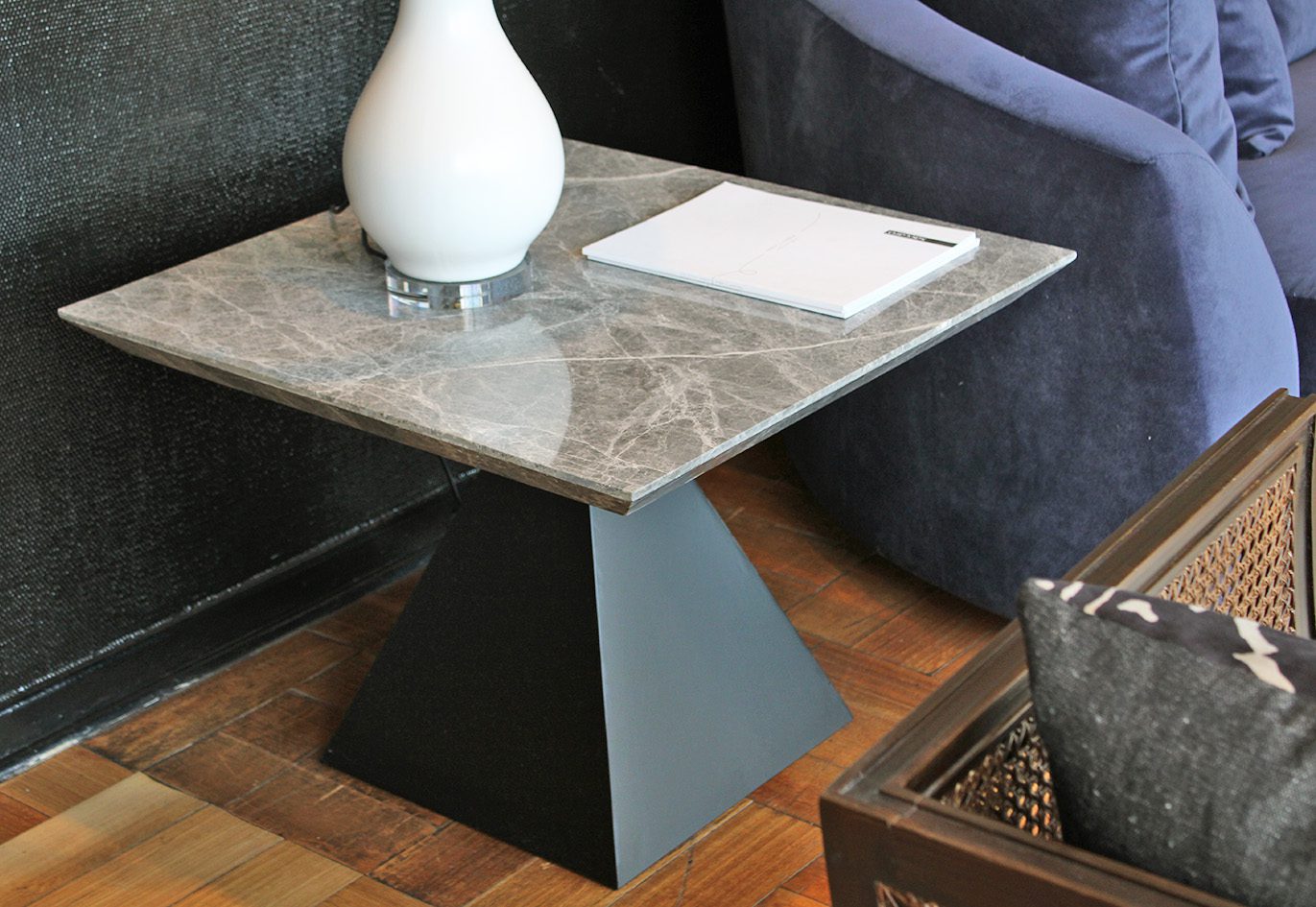Mesa lateral con cubierta de mármol «Slim Stone» terminación Hermes Gray, base nacional en fierro.
