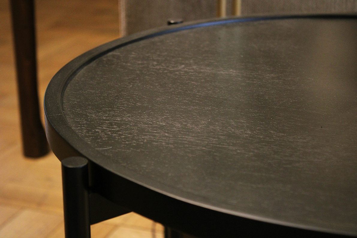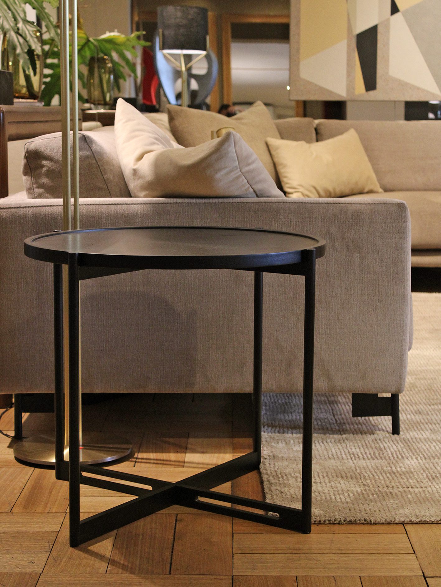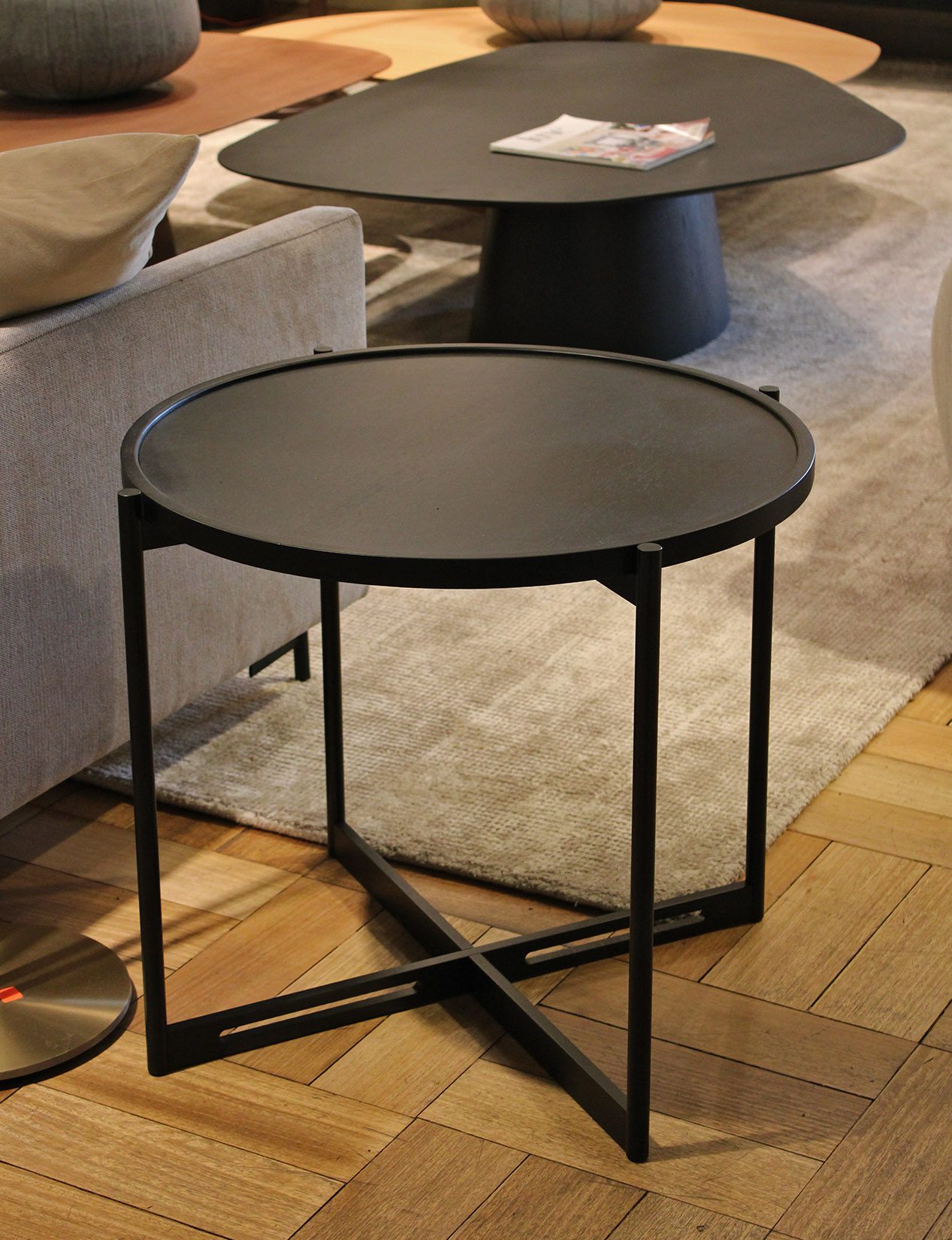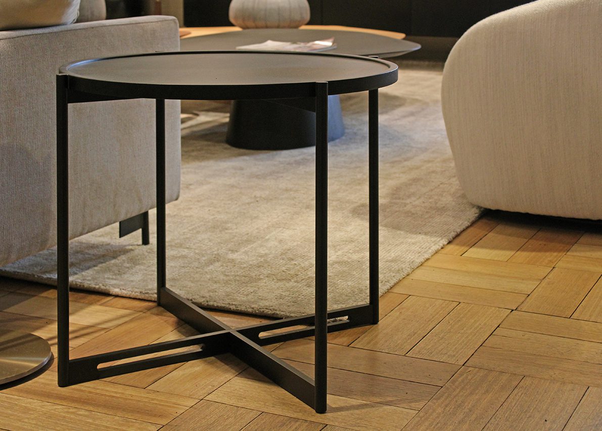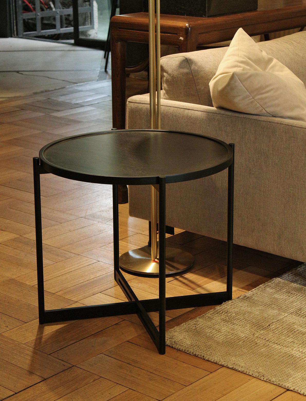 Base de aluminio con cubierta – tope con forma de bandeja con bordes de madera maciza y fondo laminado con chapa de madera natural terminación ébano.