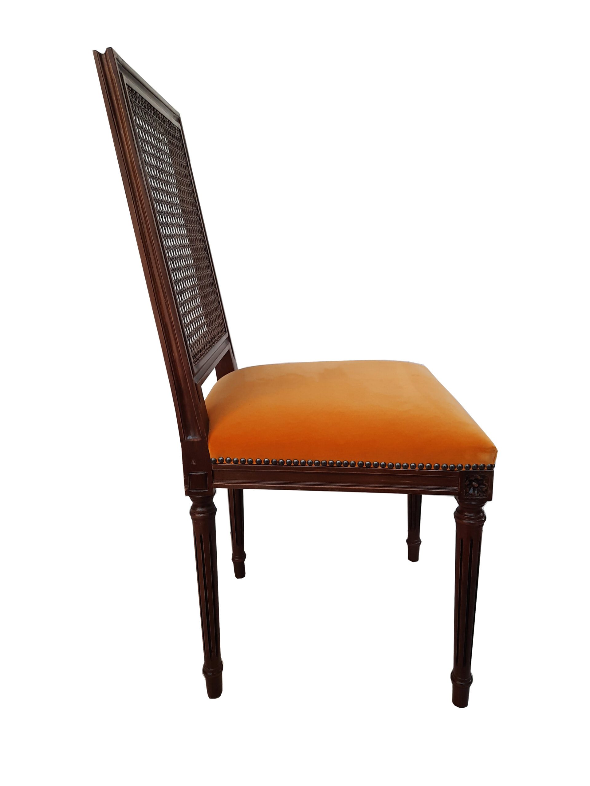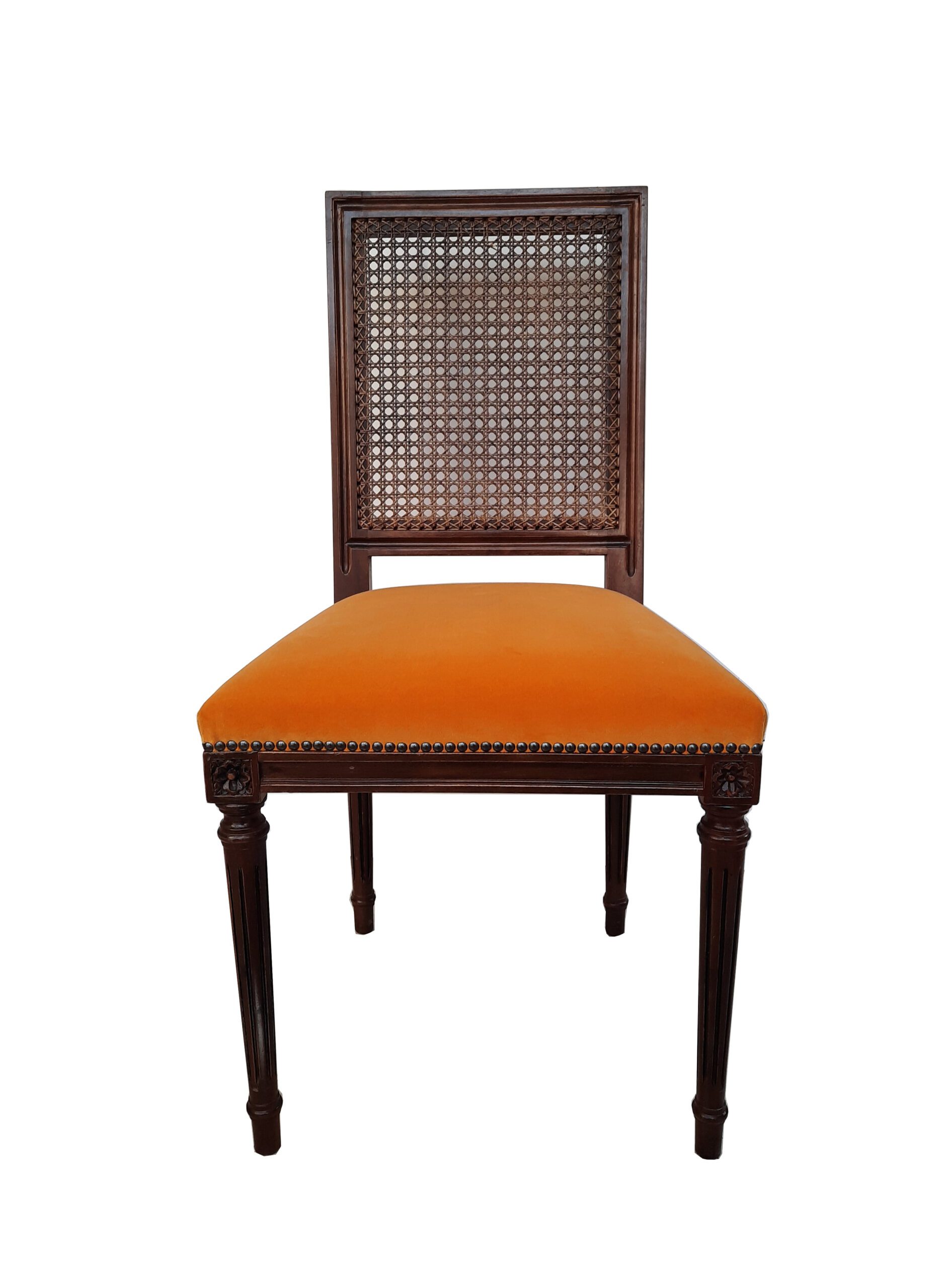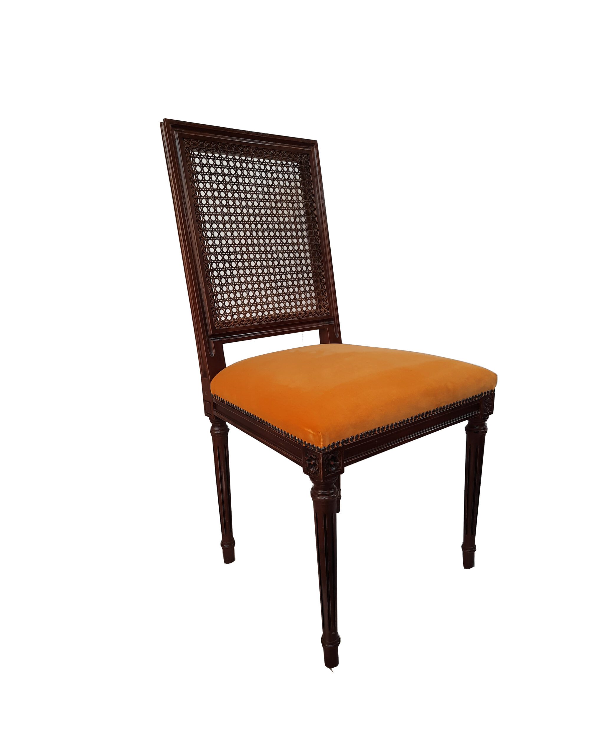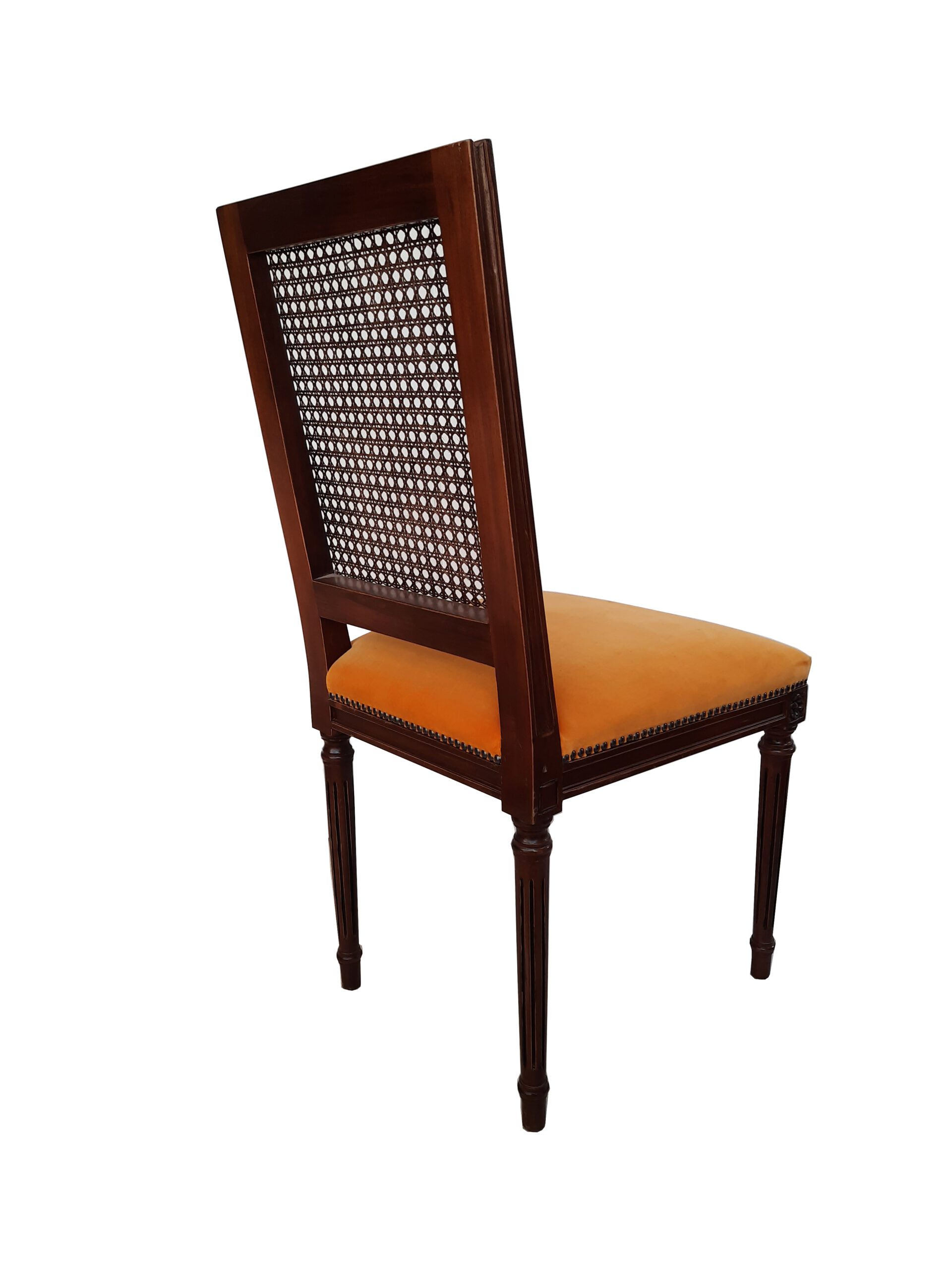 Silla nacional de estilo Francés en madera de Lenga, con respaldo en junco tejido a mano.