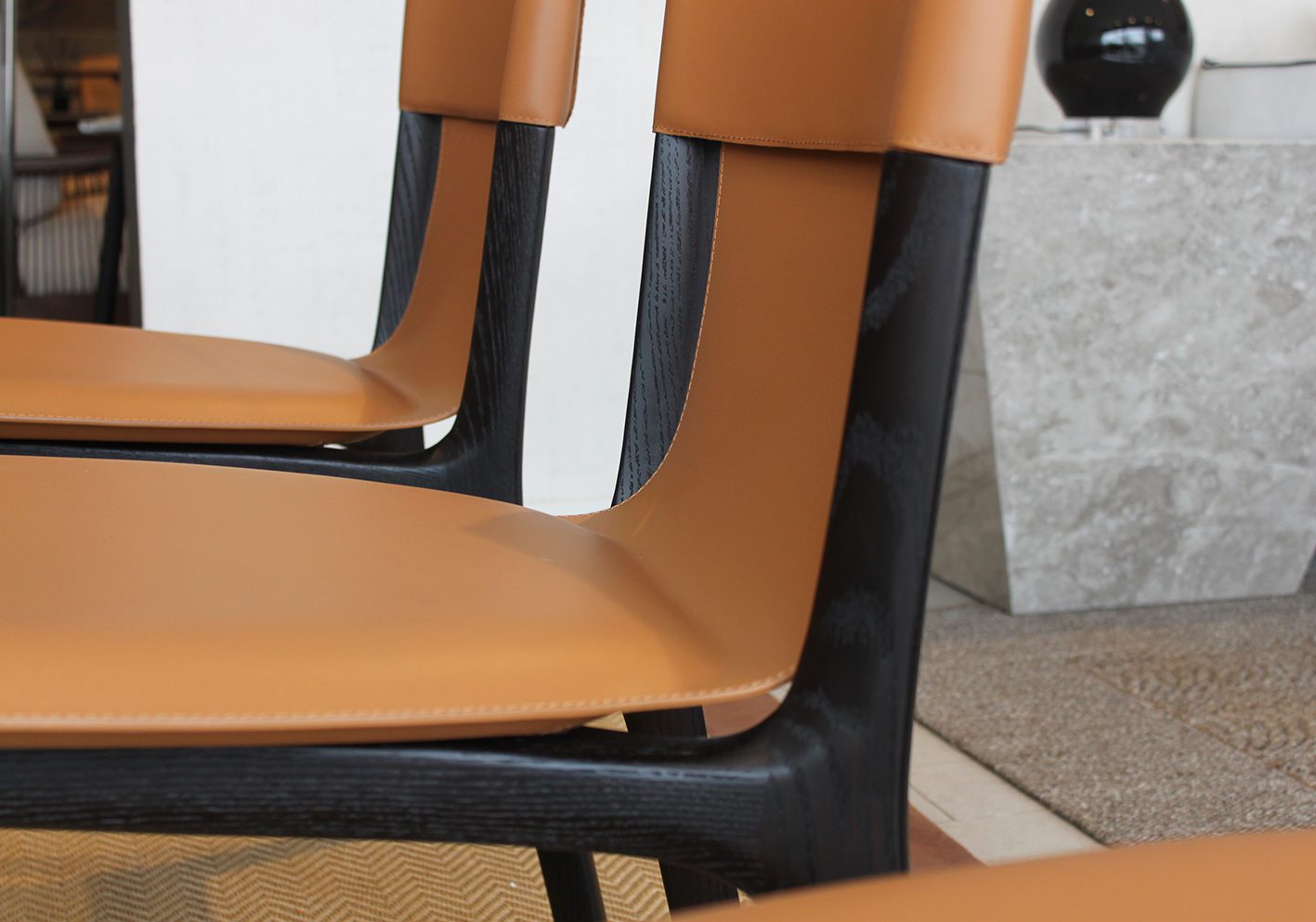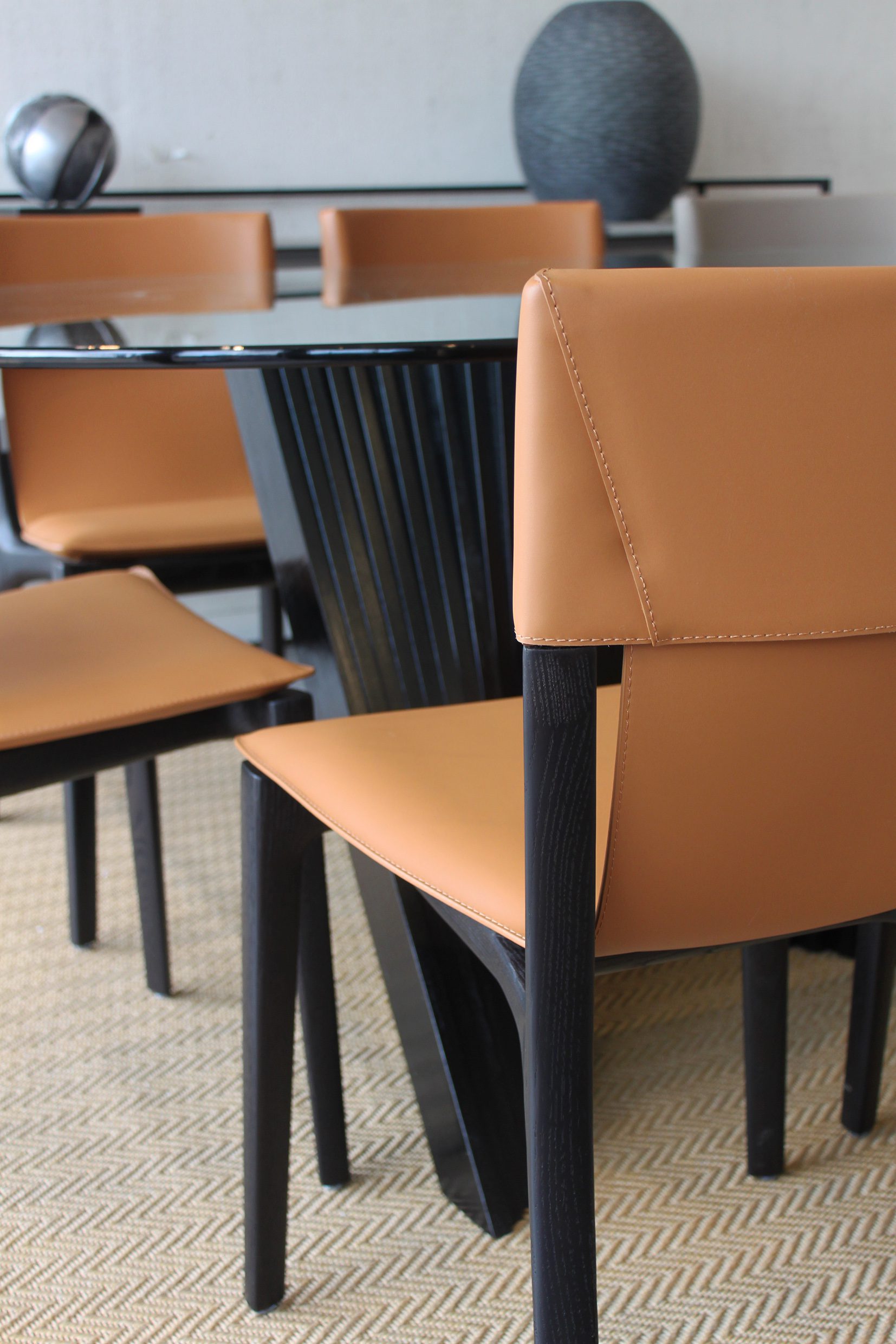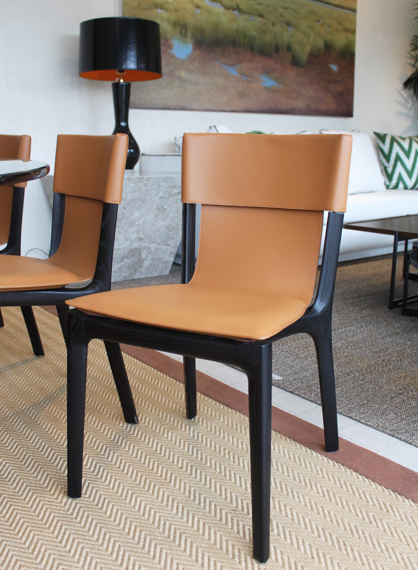 Silla en estructura de madera de Roble Americano terminación tinte negro, cuerpo en cuero natural color camel, asiento acolchado.
