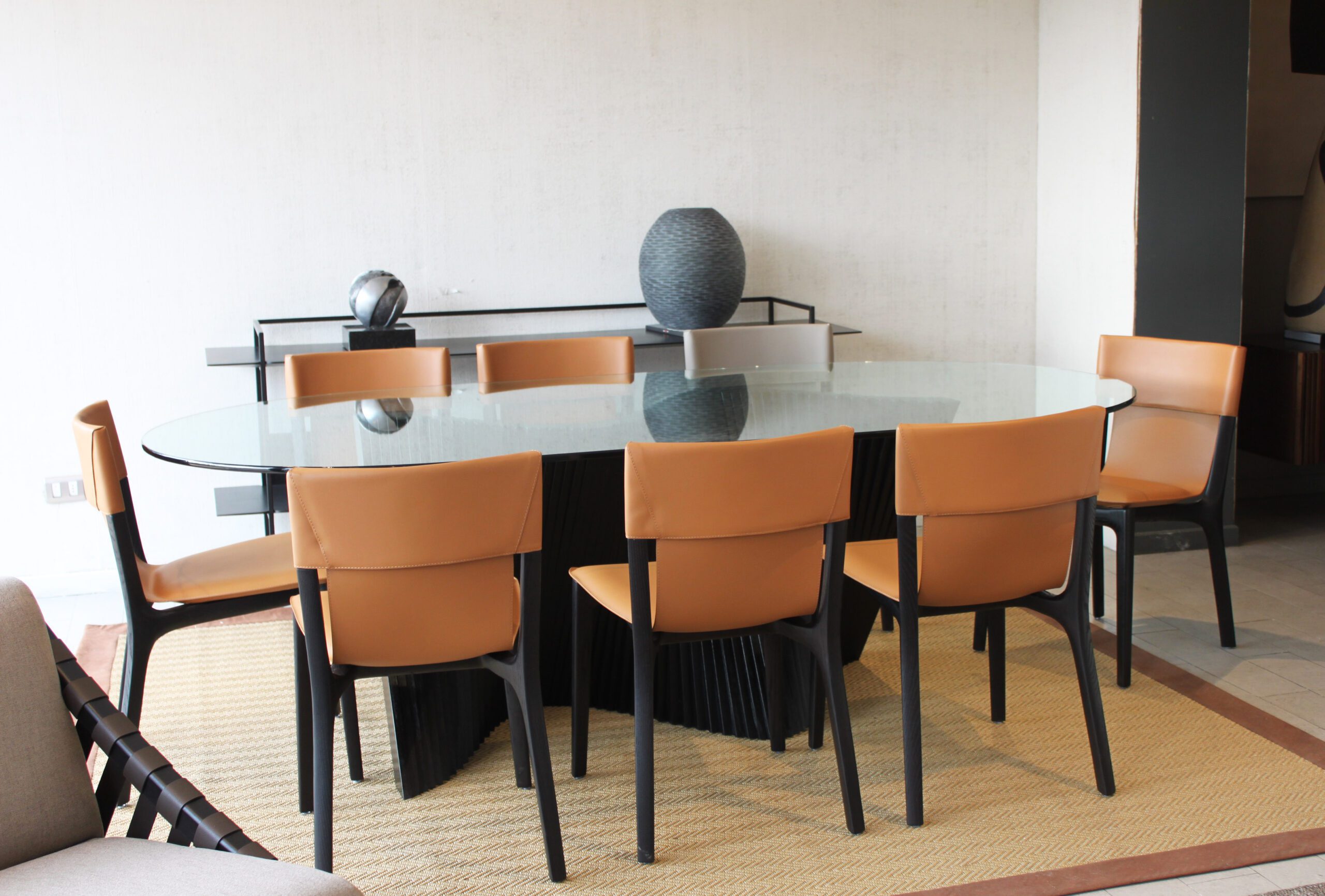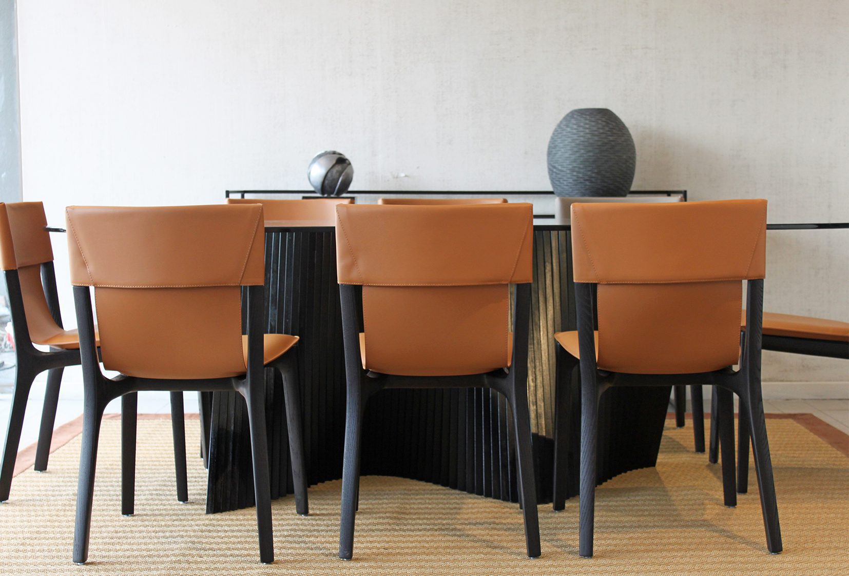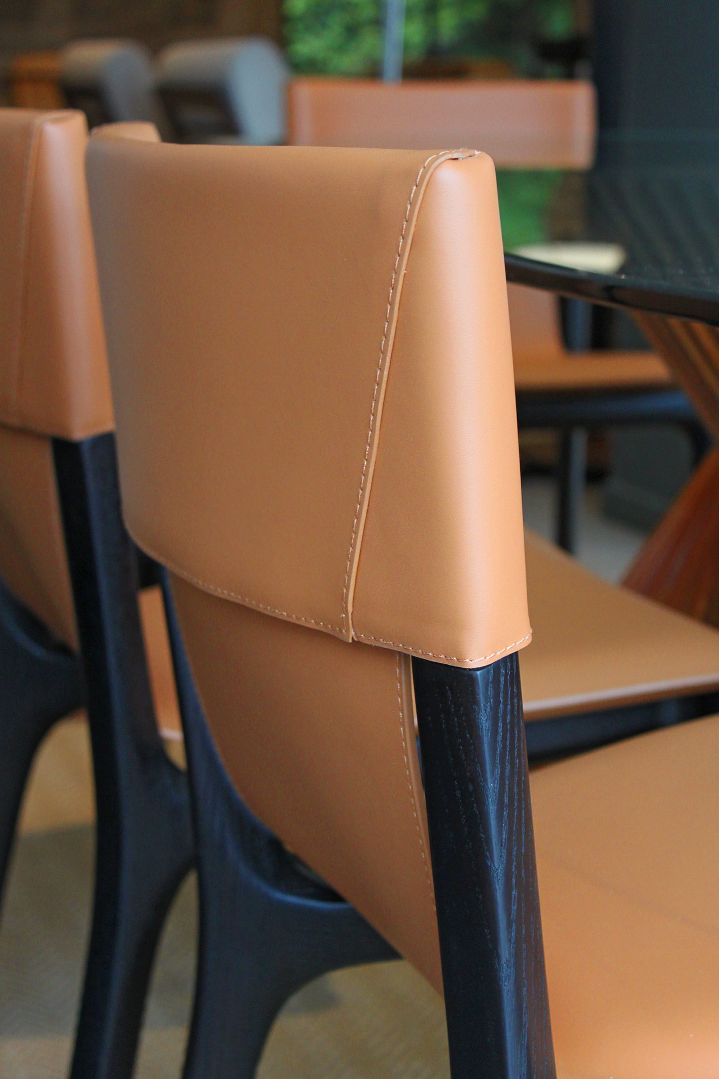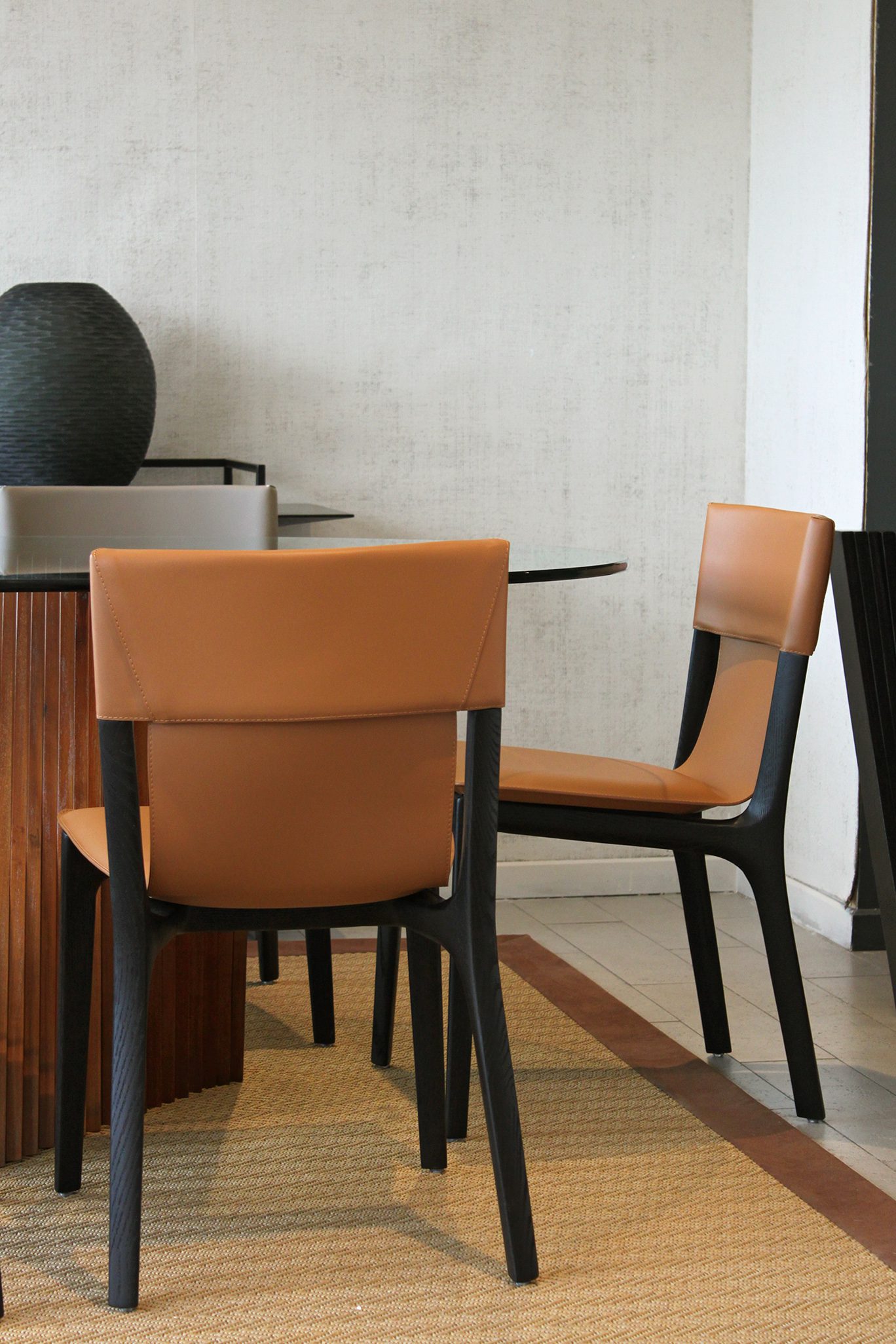Silla en estructura de madera de Roble Americano terminación tinte negro, cuerpo en cuero natural color camel, asiento acolchado.