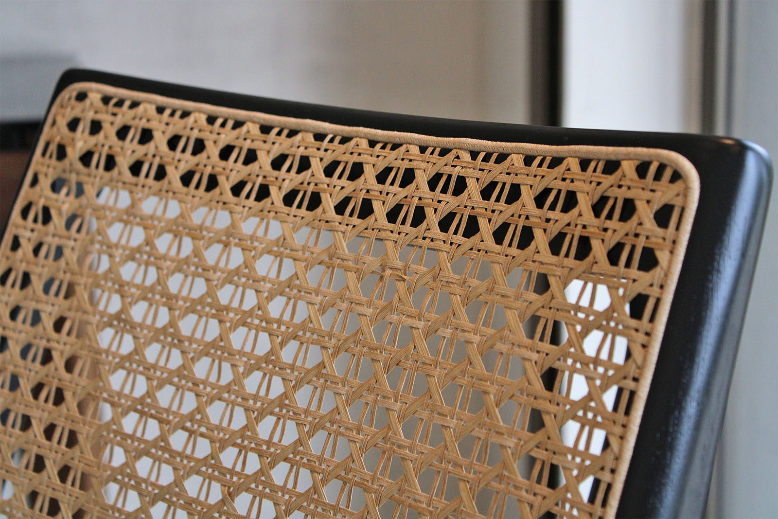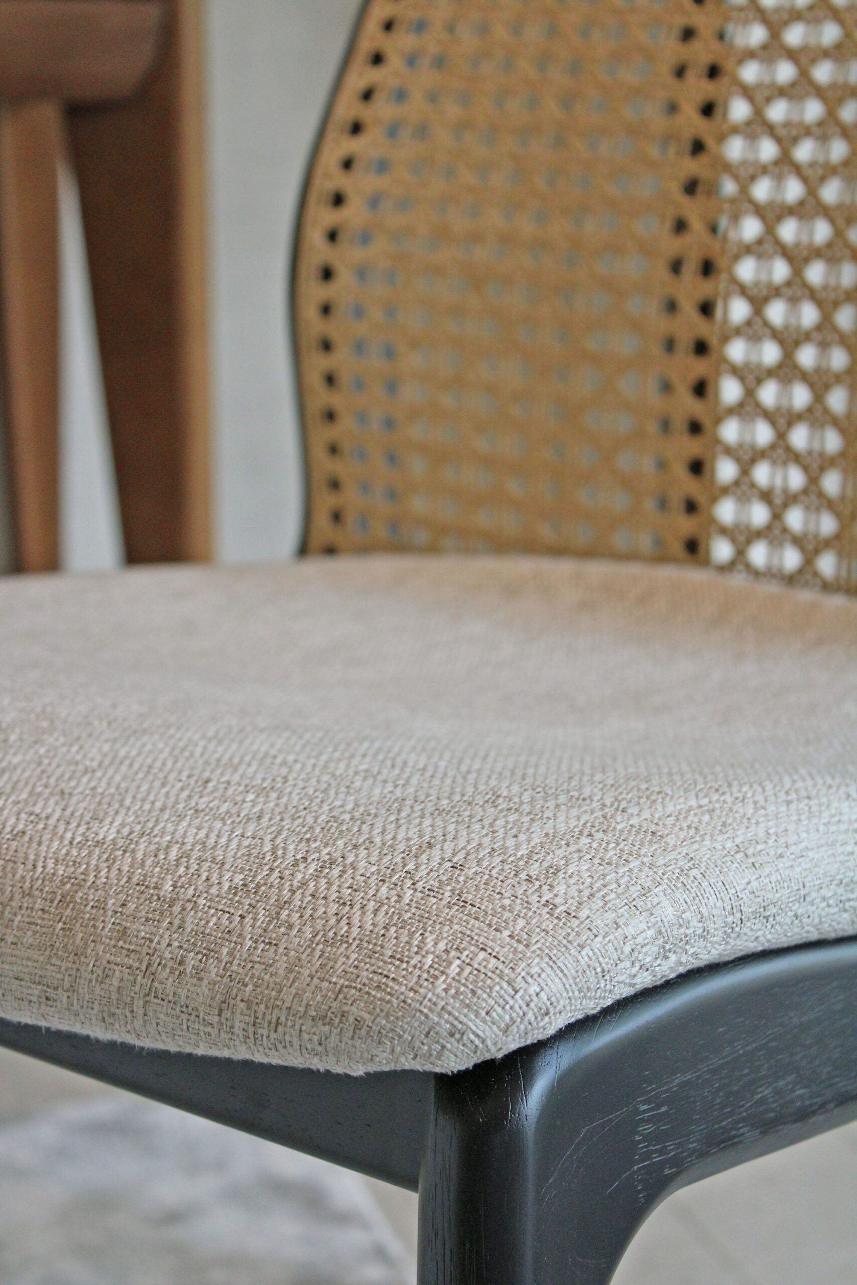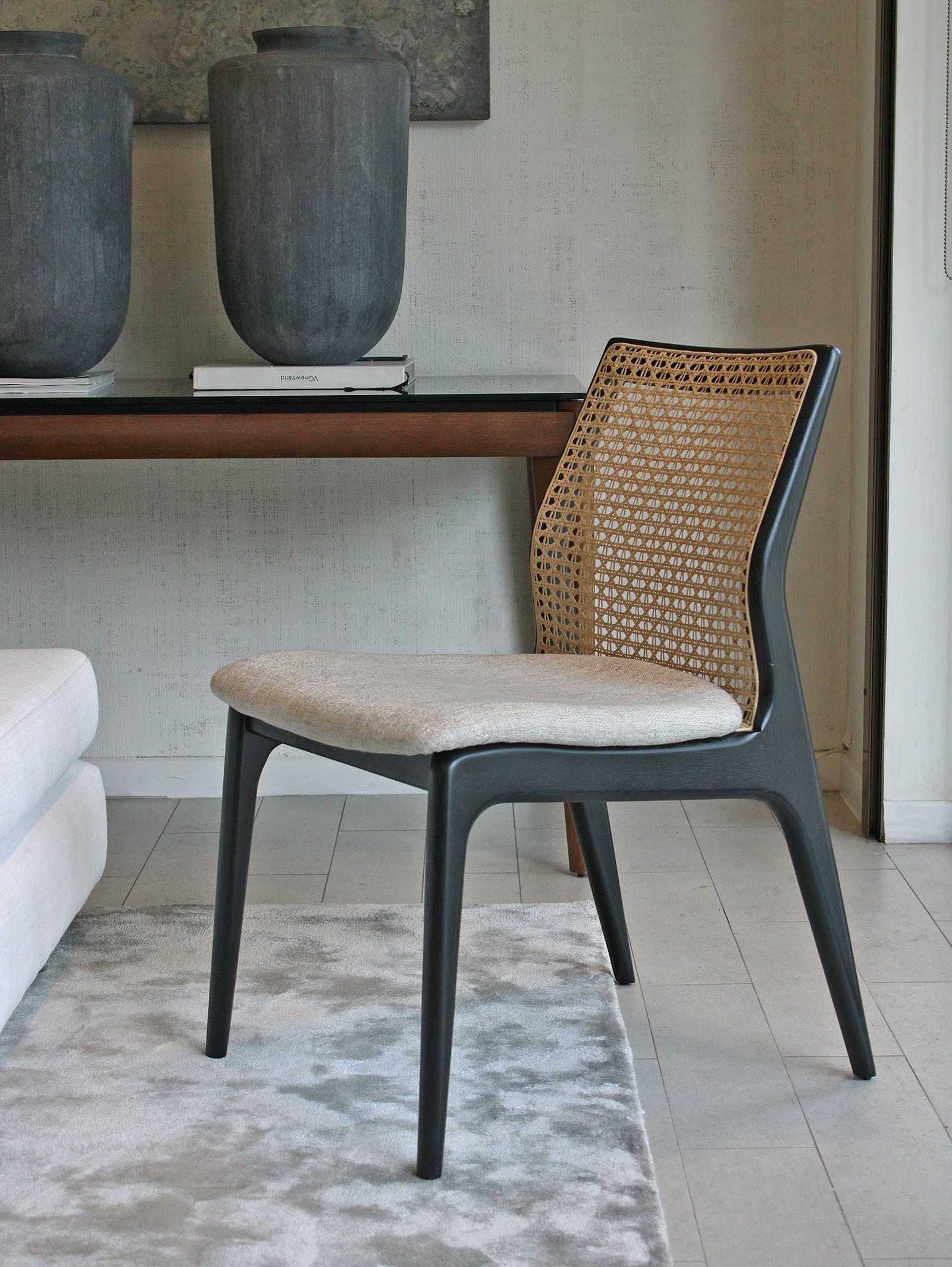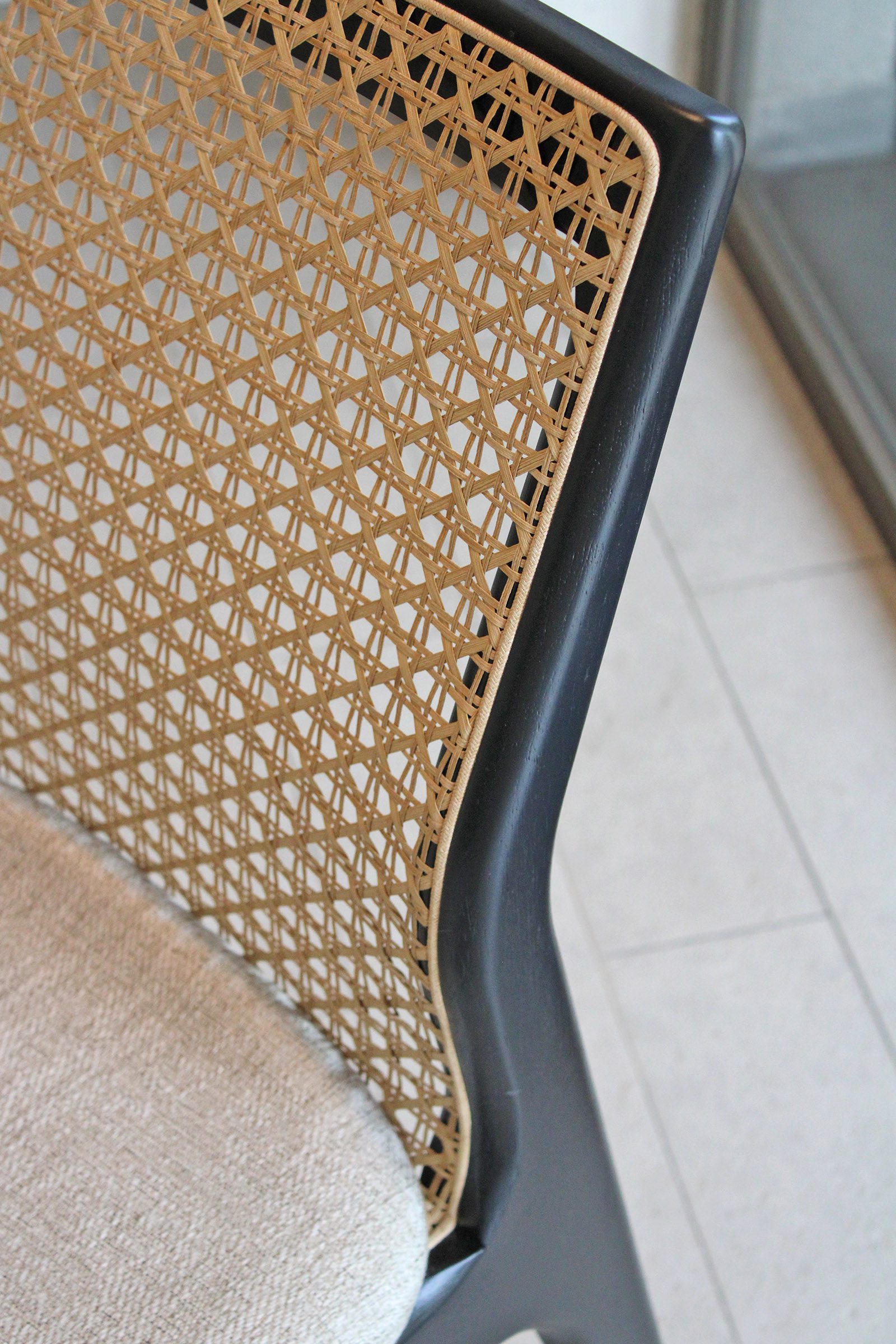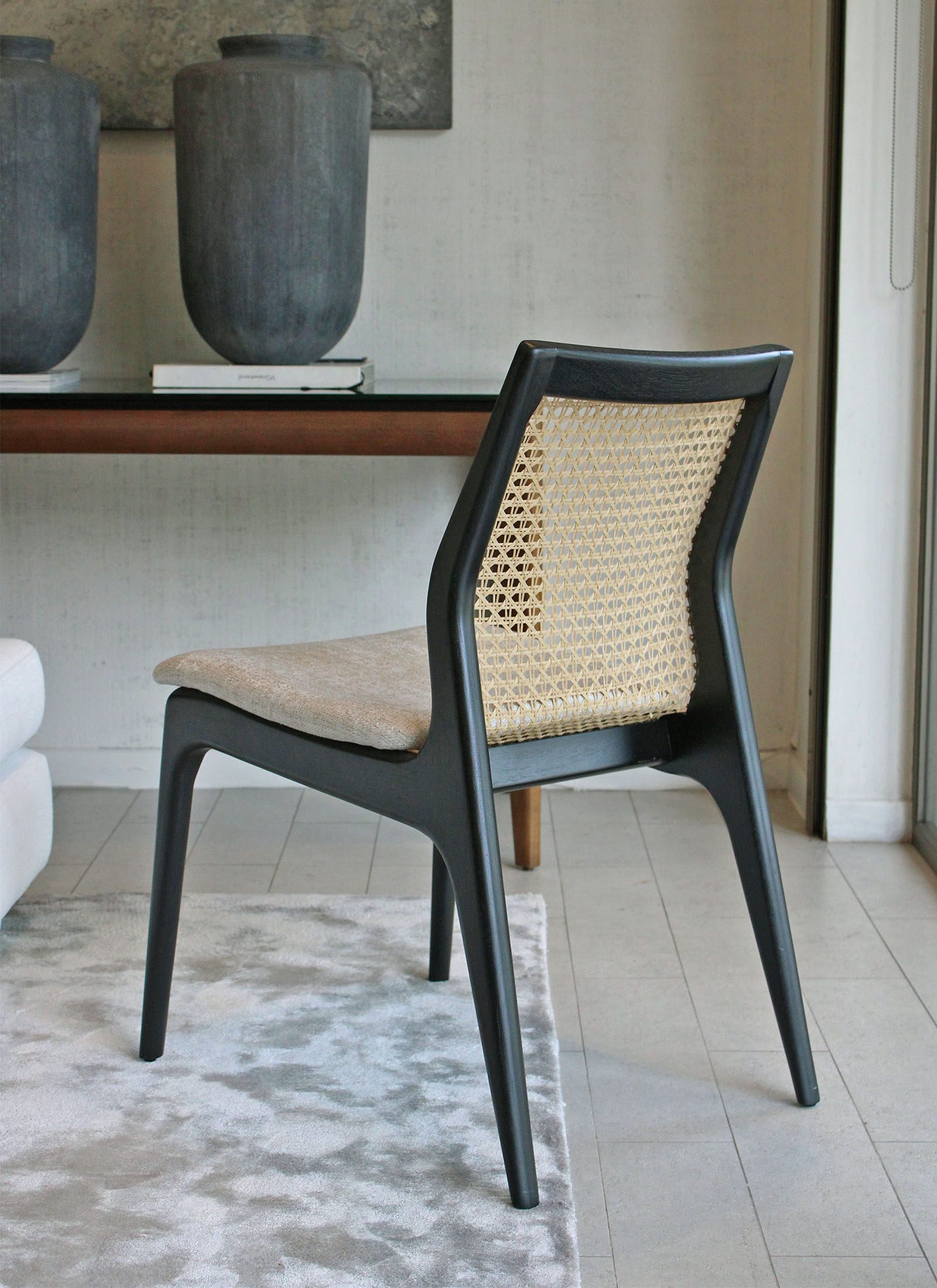 Silla brasilera importada, cuerpo en madera sólida terminación ébano, respaldo enjuncado natural y asiento acolchado.