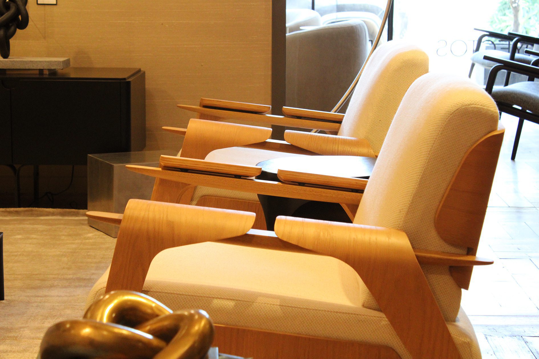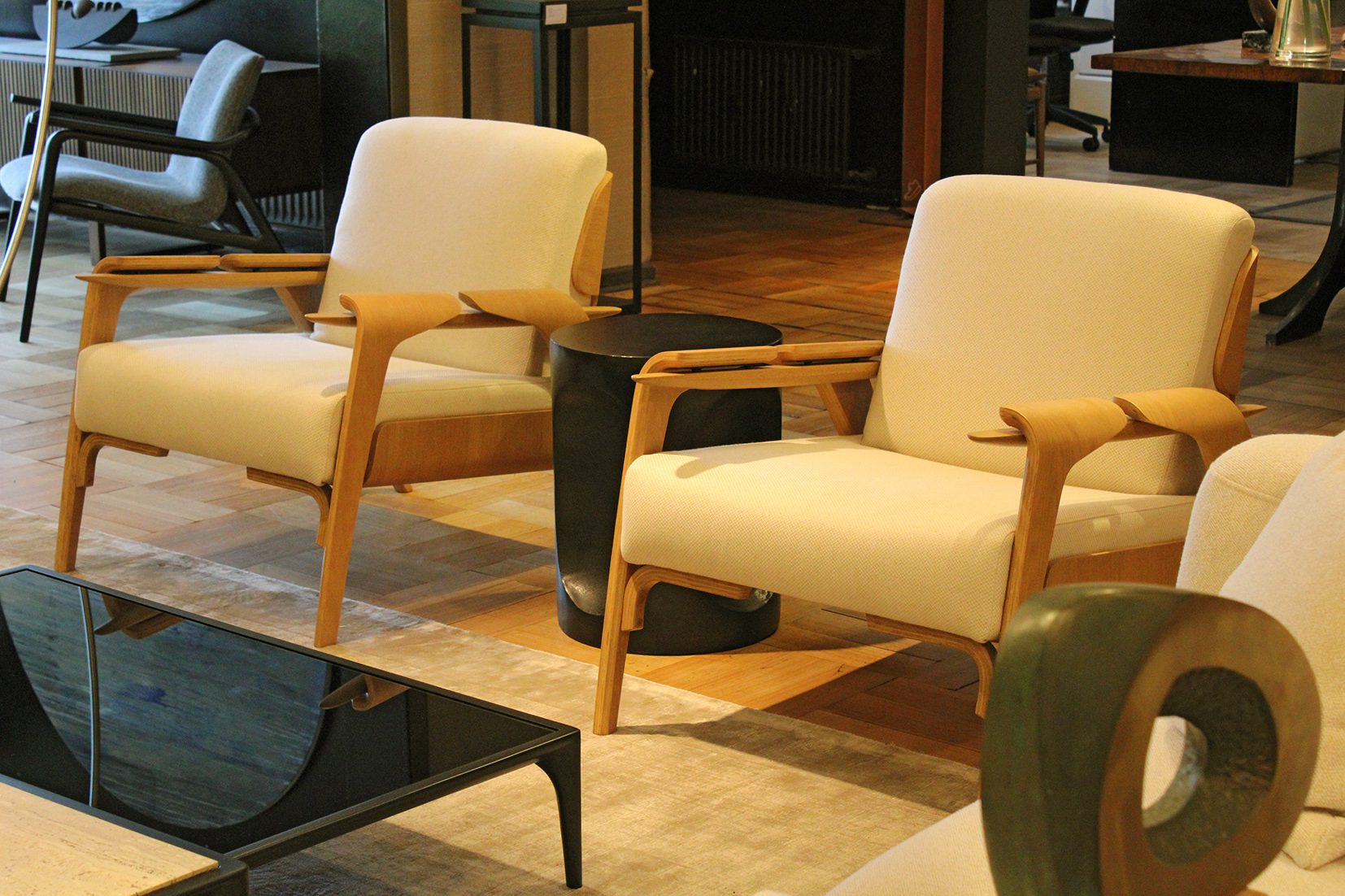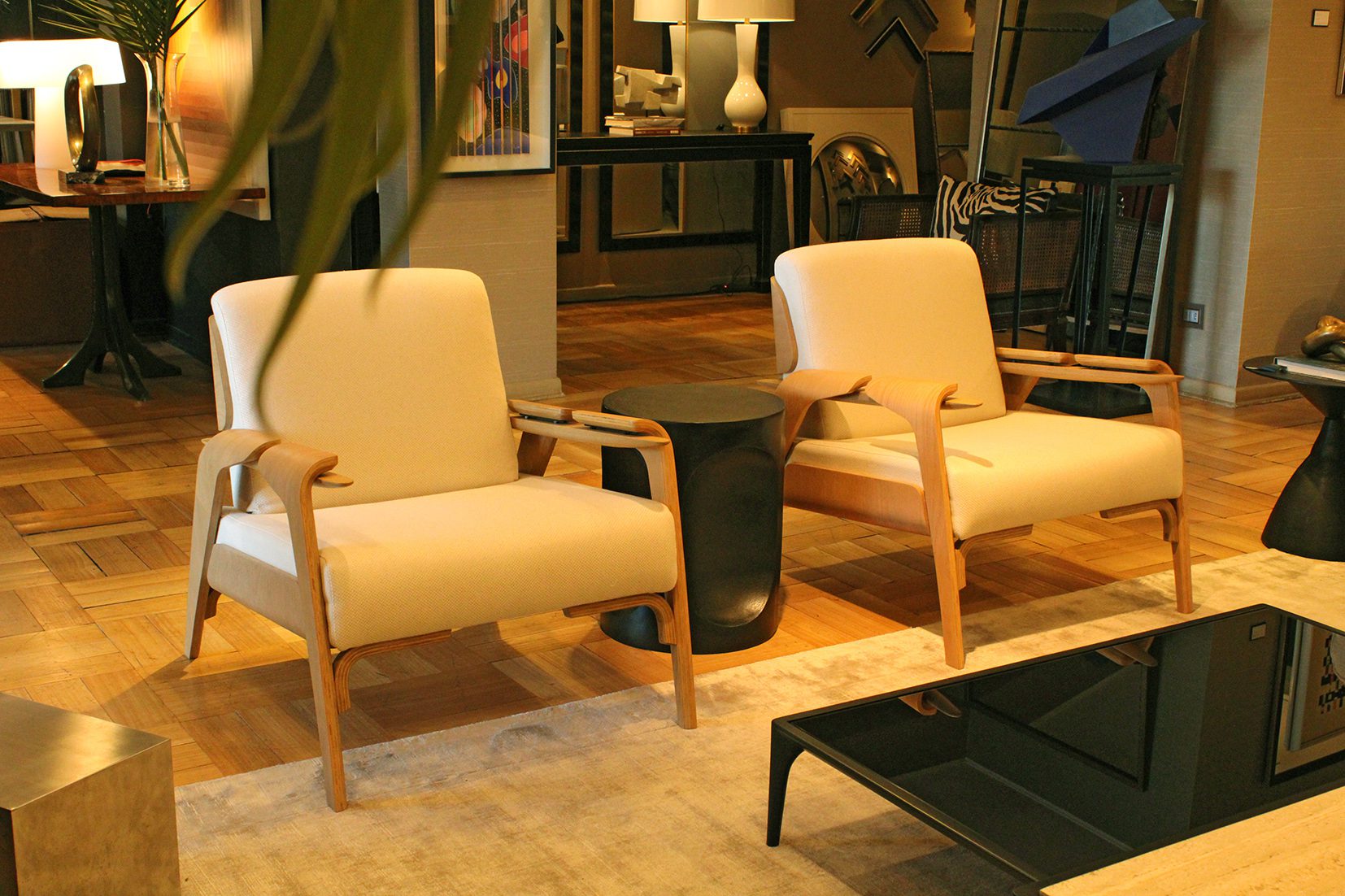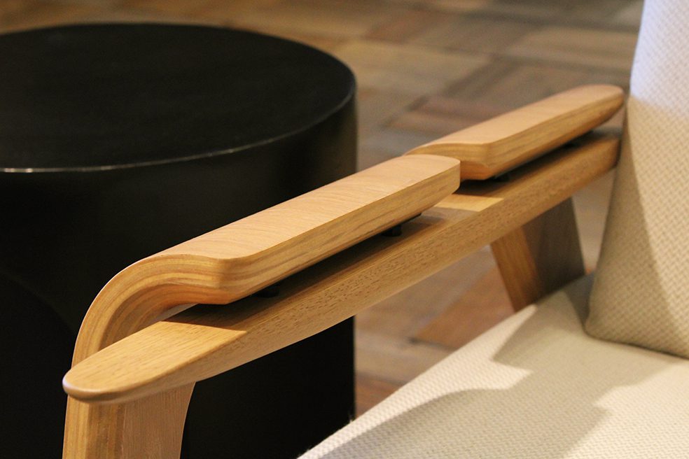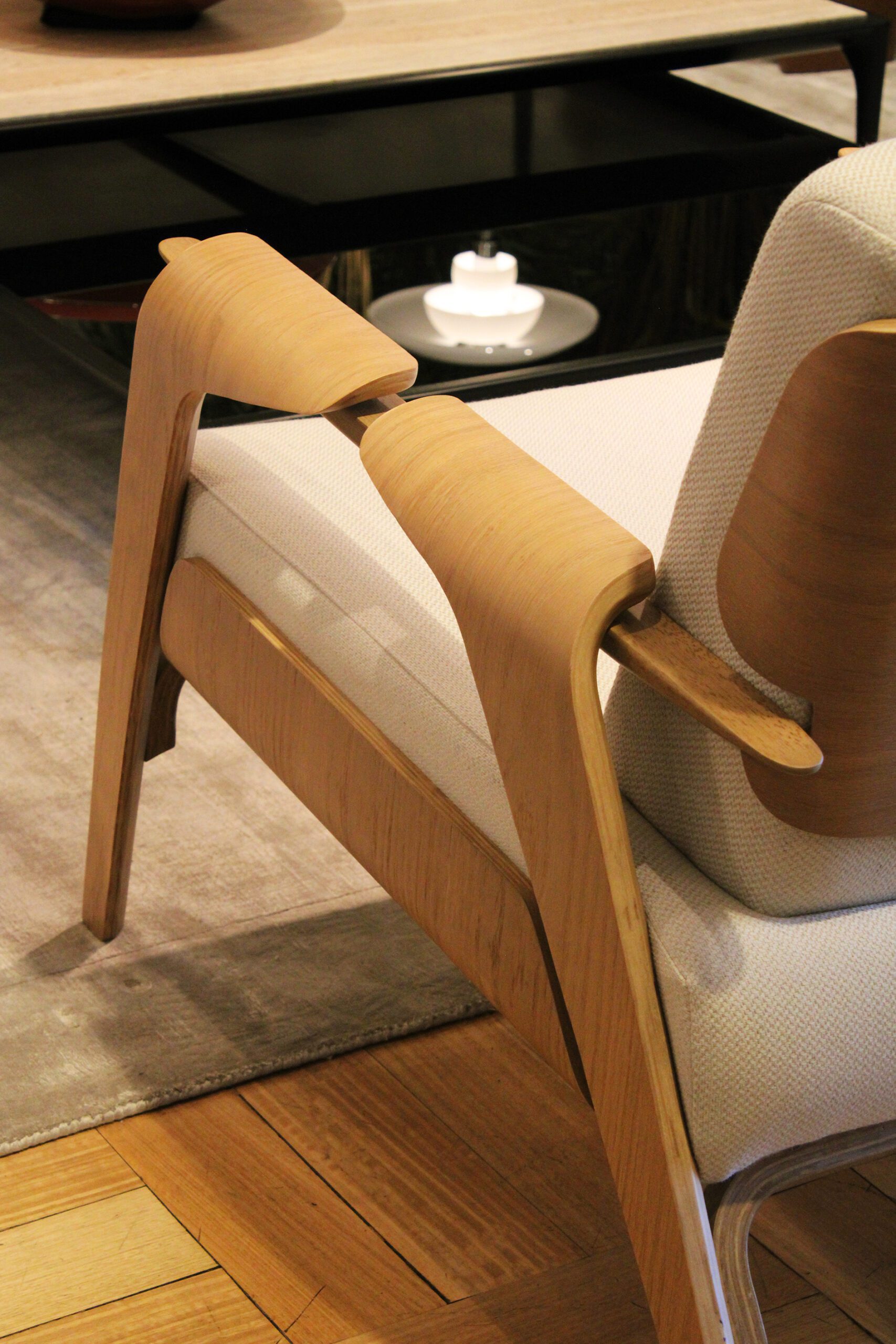 Estructura en madera contrachapada curvada, cuerpo y respaldo de espuma acolchado.