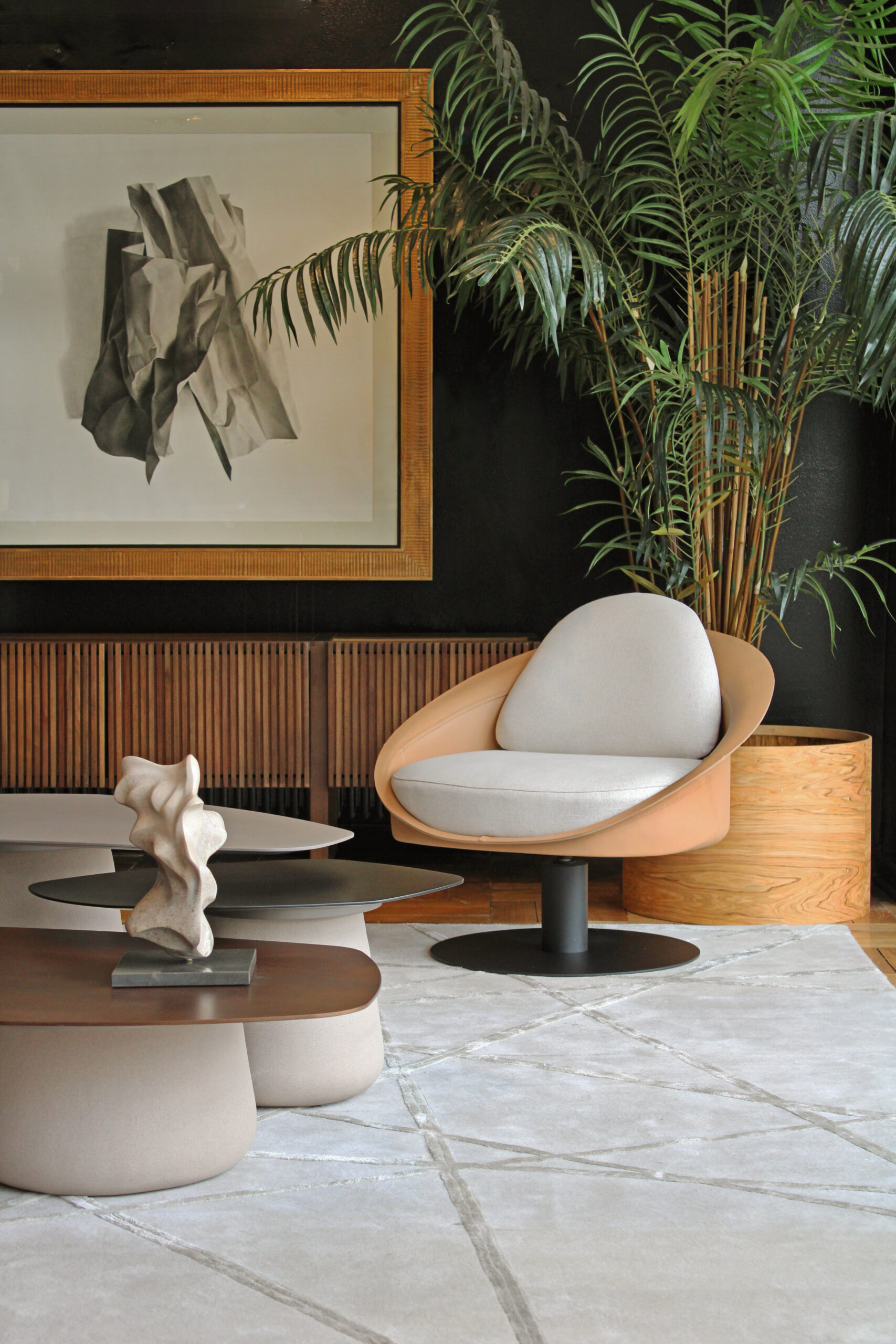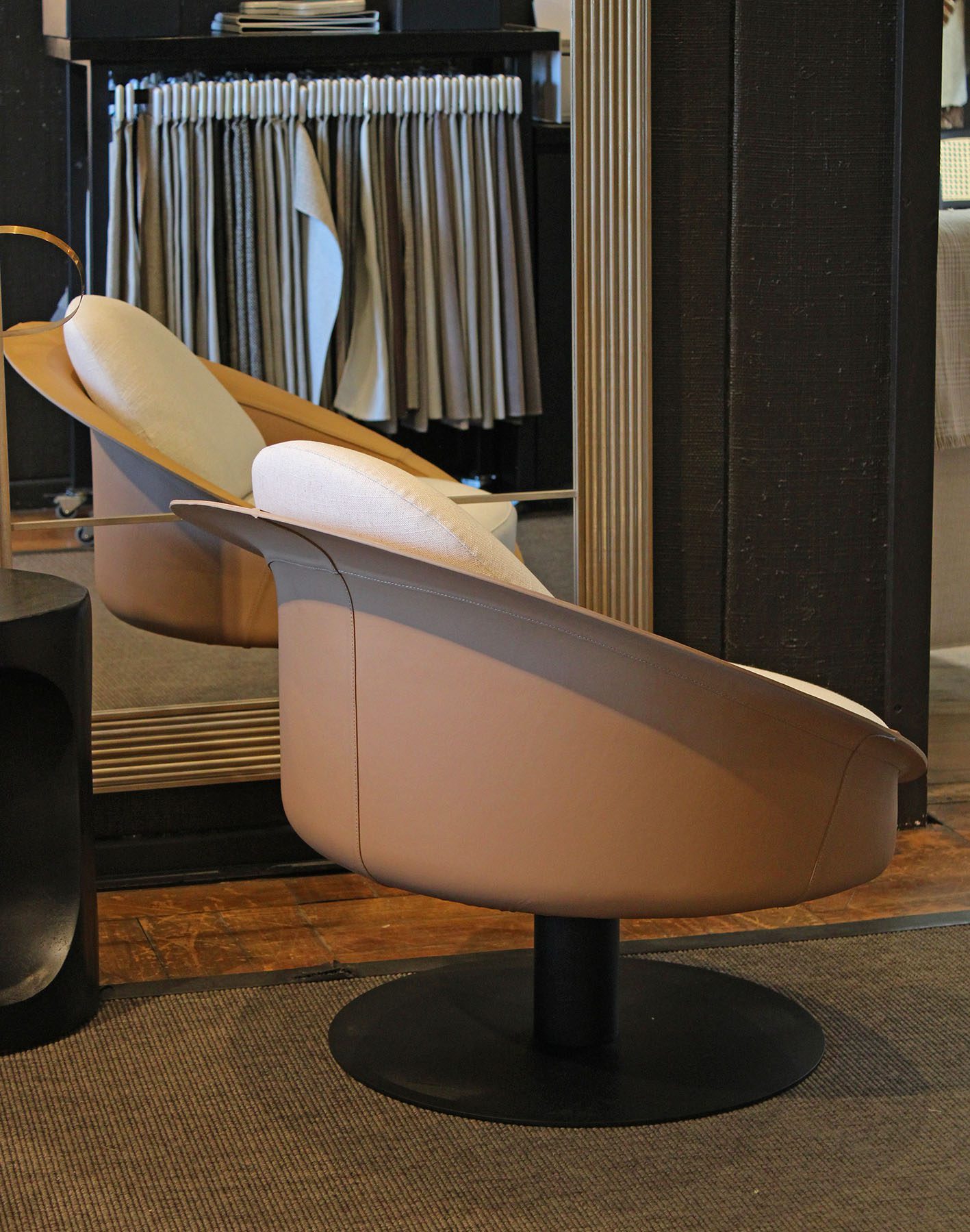 Sillón brasilero importado, cuerpo redondo que reposa sobre una base giratoria de metal, dando una sensación de flotabilidad.
