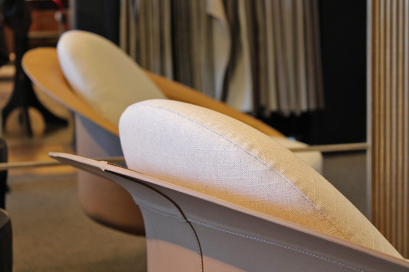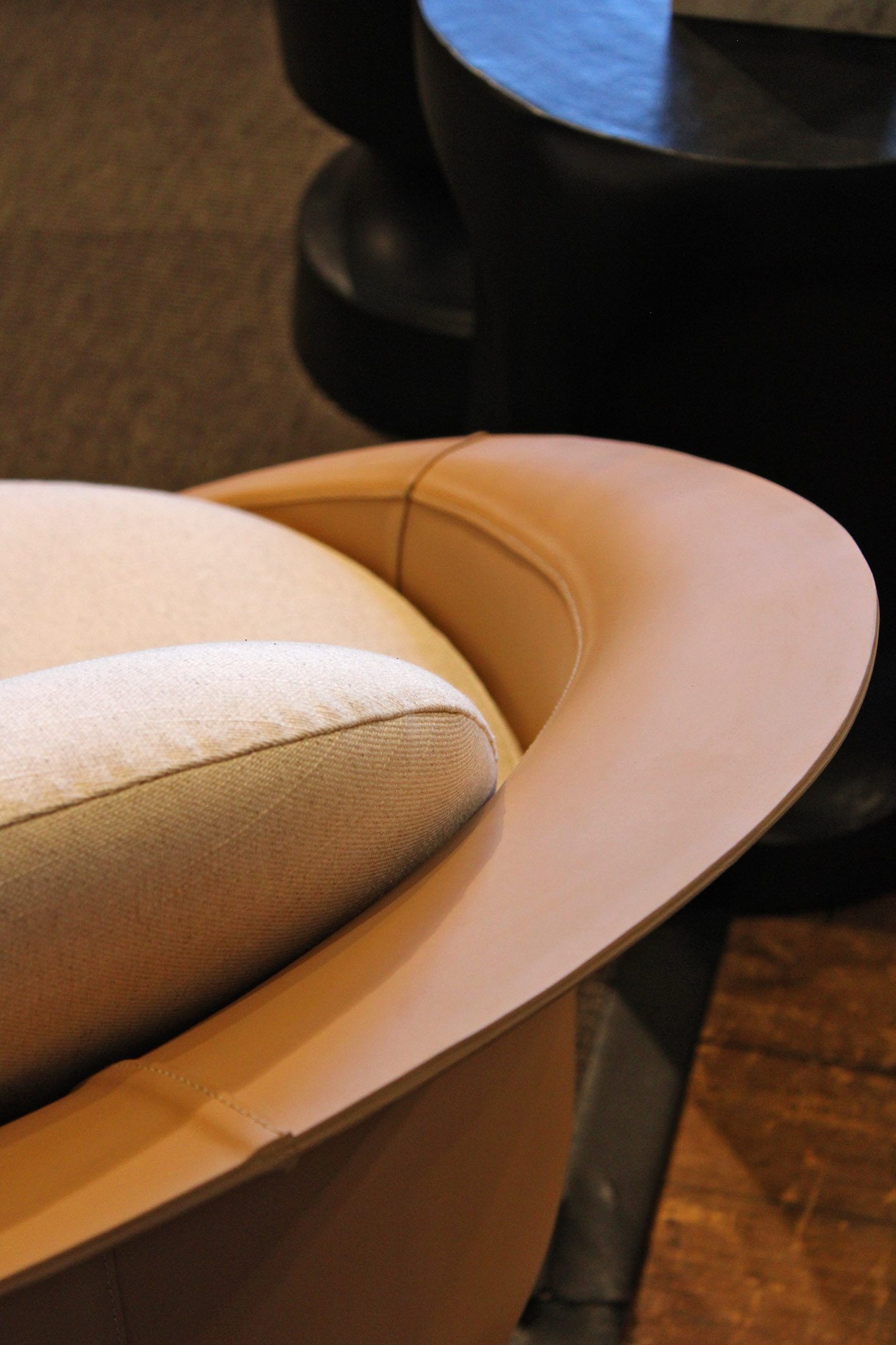 Base de acero al carbono pintado en negro mate, cuerpo en fibra de vidrio revestido en cuero natural tipo suela que es más grueso, firme y resistente. Cojines y asiento tapizados en género.