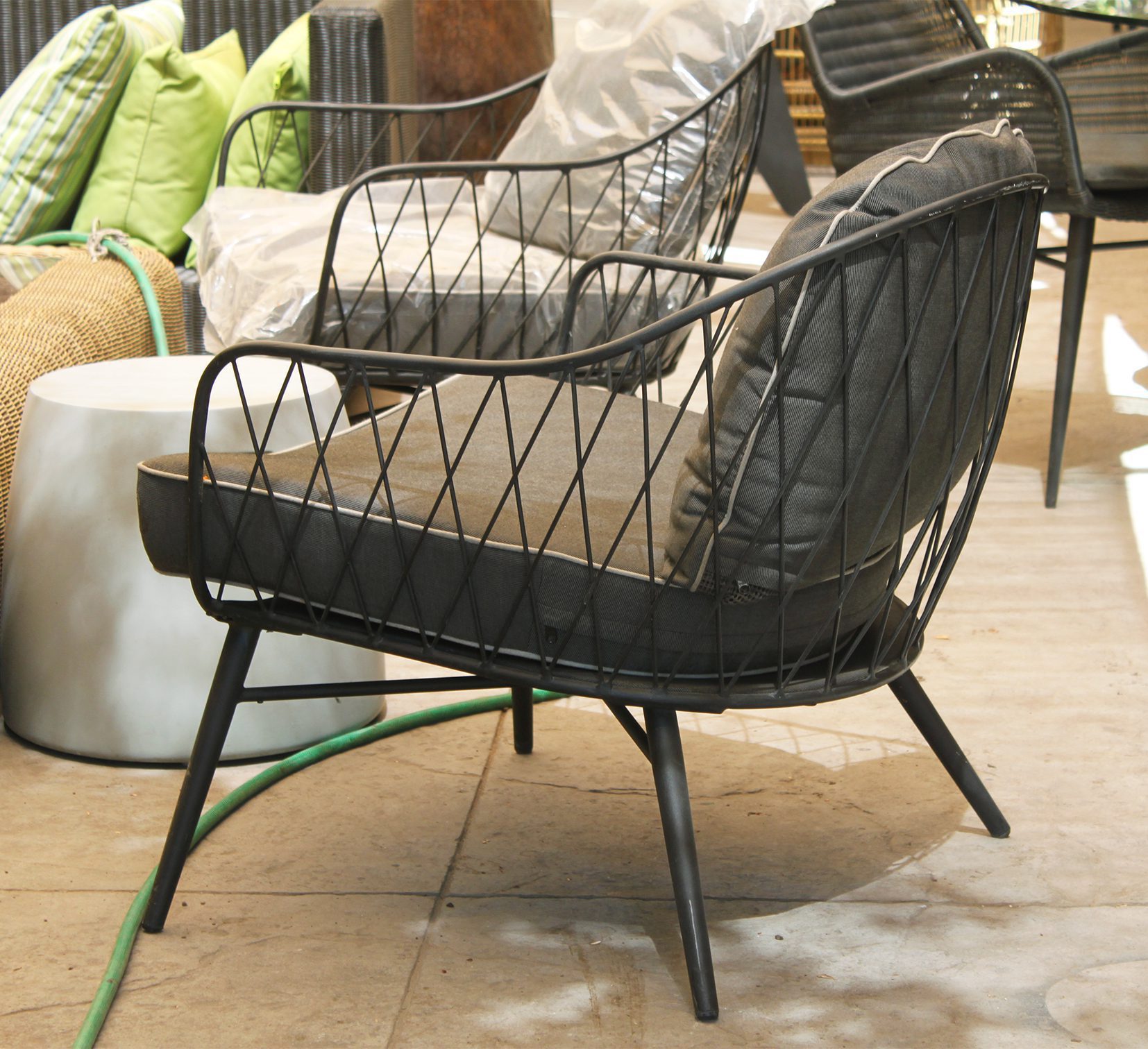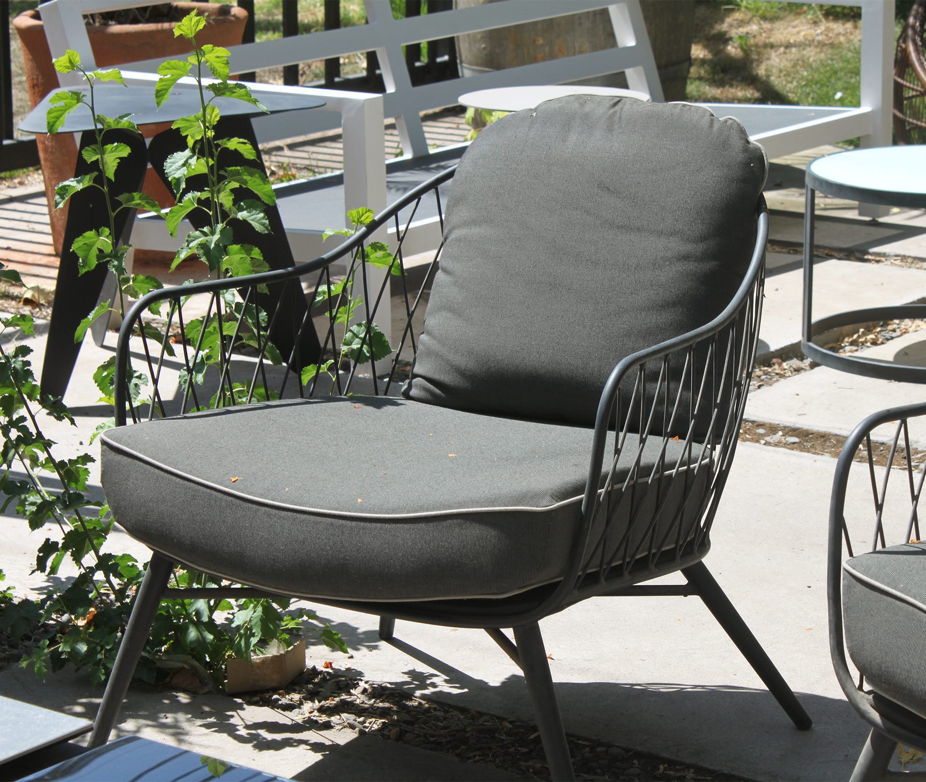 Sillón de un cuerpo con estructura metálica y cojinería resistente al sol y repelente al agua con fundas hidrófugas.