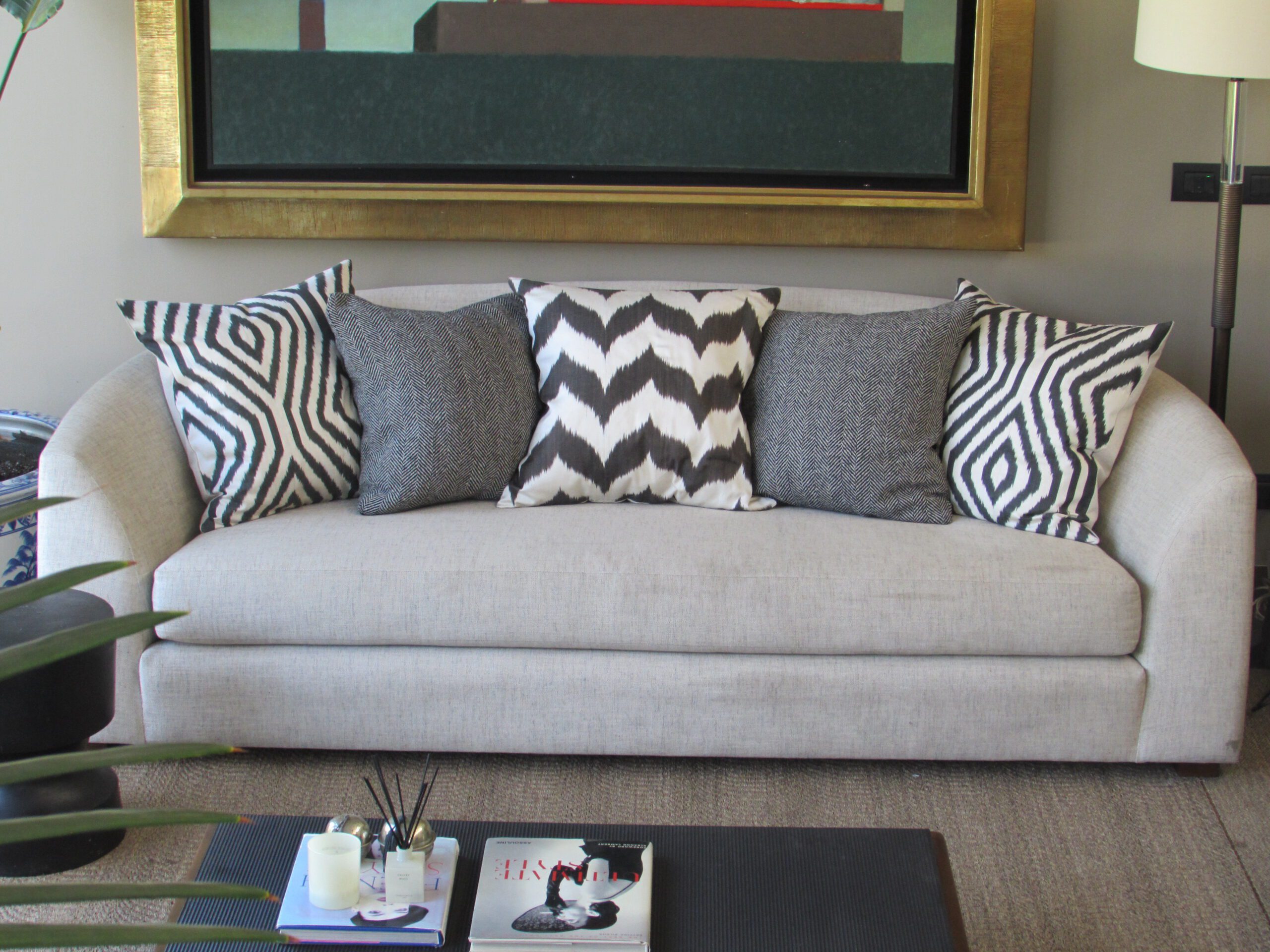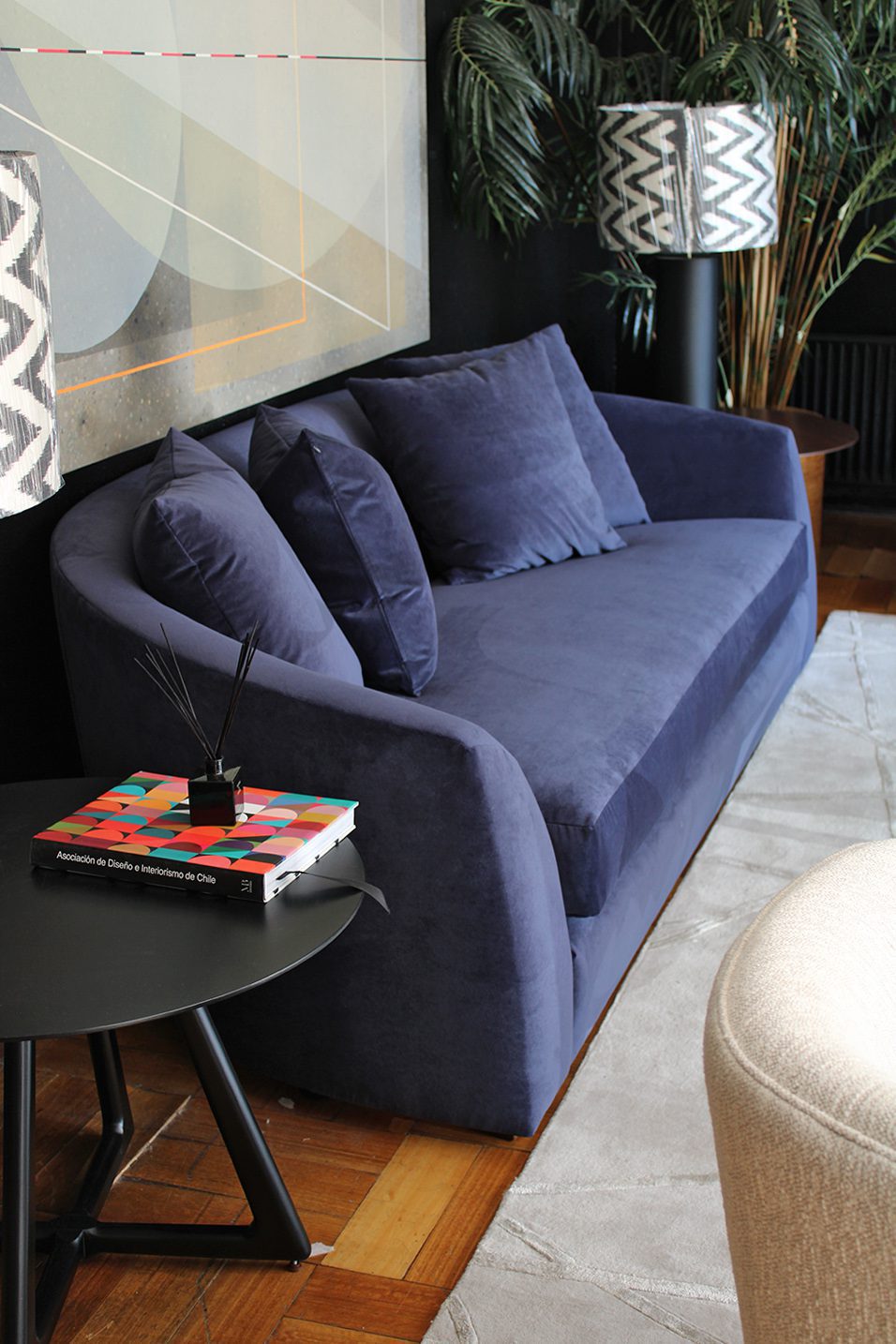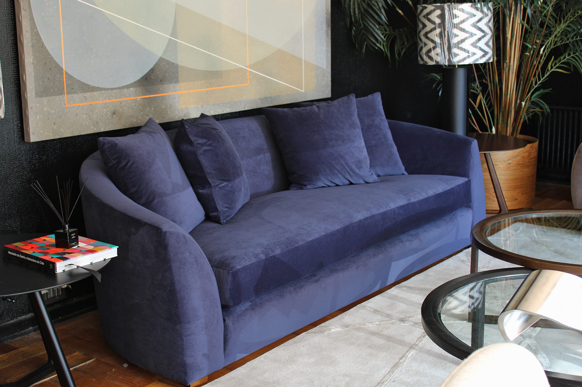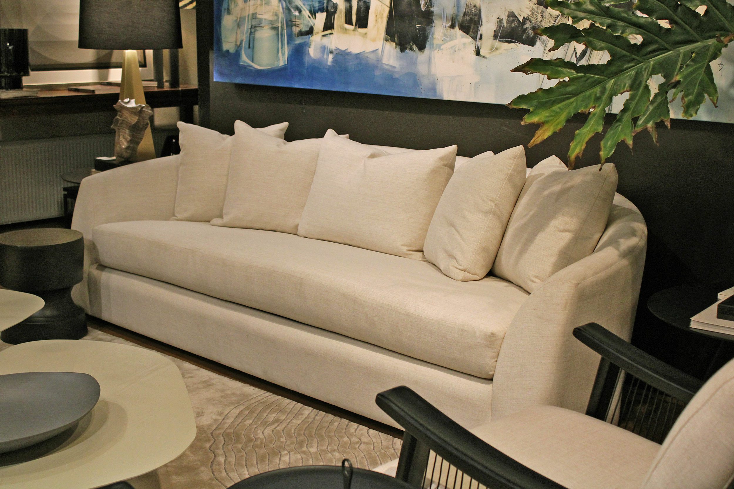 Sofá con estructura en madera de Lenga, fuelle relleno con resortes y espuma de alta densidad. Cojines del respaldo rellenos con pluma.