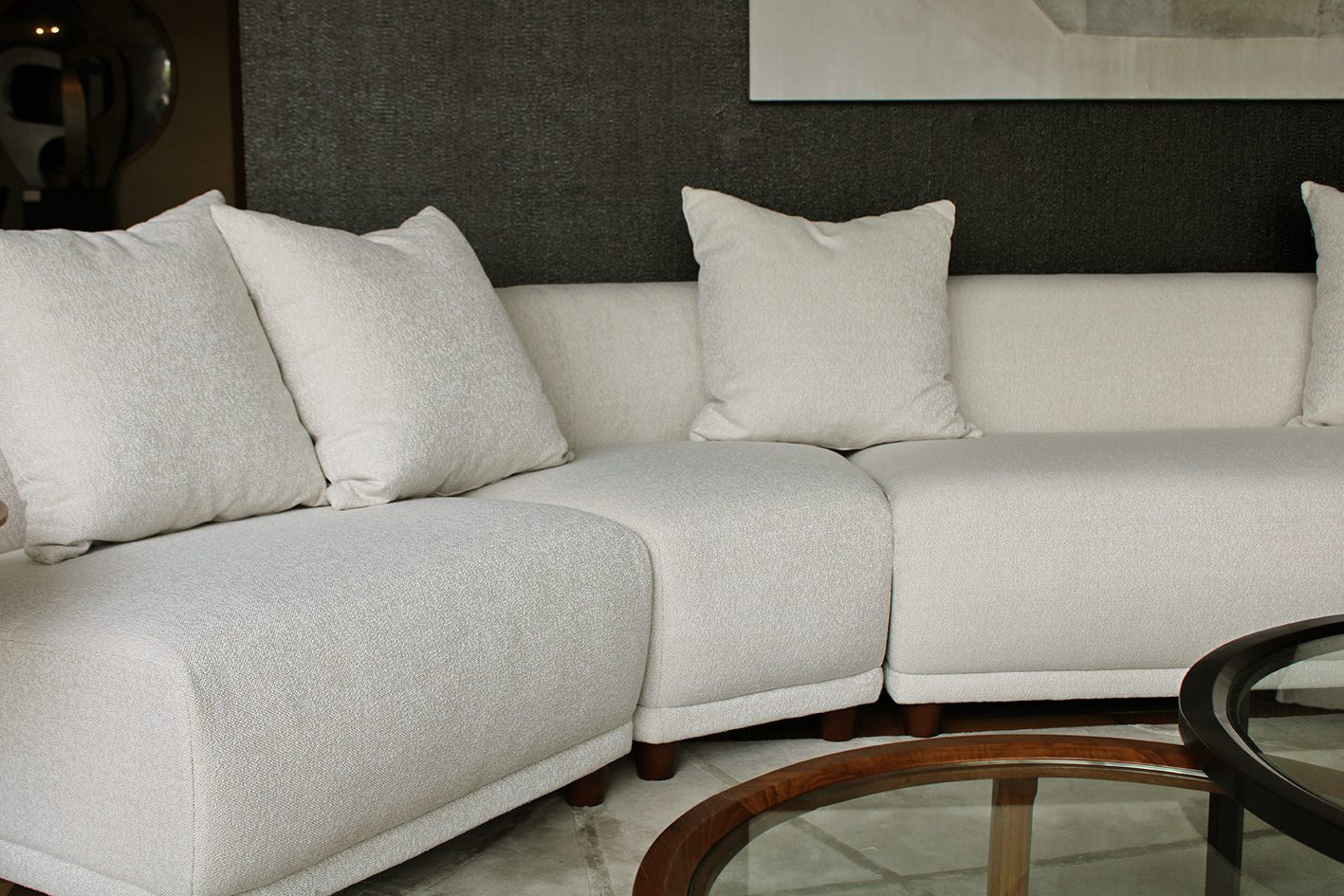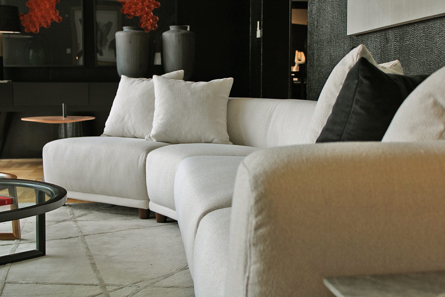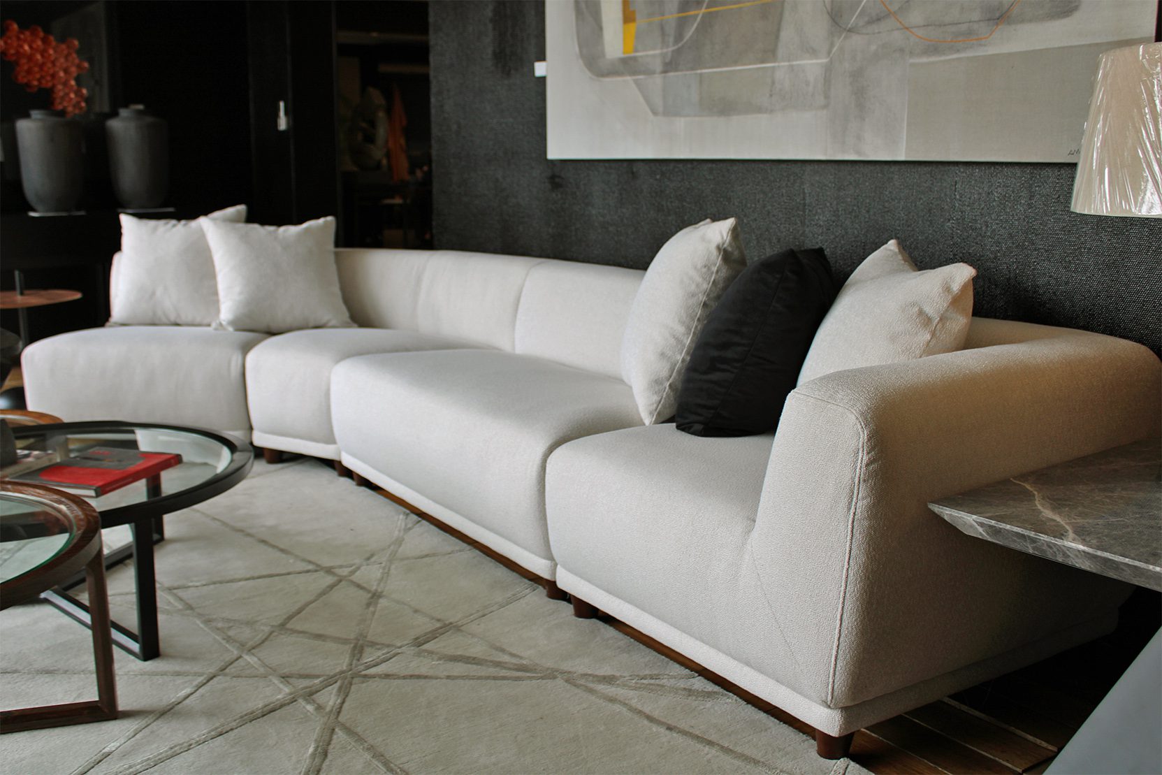Sofá importado que consta de 6 módulos que se pueden seleccionar indistintamente y conjugar de diversas maneras. Todos los módulos tienen la misma profundidad por lo que se pueden reagrupar y distribuir según necesidad.